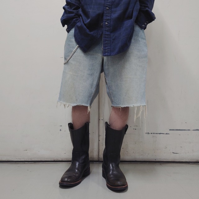Levi's 550カットオフショーツデニム。 ワイドシルエットデニムを切りっぱなしにしたデザイン。 Levi'sならではの柔らかく履きこまれた風合いが◎。 ブーツとのスタイリングやレイヤードにもオススメです。 ◇DESCRIPTION◇ brand / country Levi's/ アメリカ size 表記: - 実寸(cm) ウエスト:40 股上:31 股下:25 わたり:34 裾幅:27 (model: H170 W55) color ウォッシュドブルー material コットン100% made アメリカ製 feature ・ハーフパンツ ・色落ちカラー ・ジッパーフライ ・カットオフ caution 所々 シミがございます。 ※こちらの商品は古着となります。予めご了承下さい。 #dnmselection