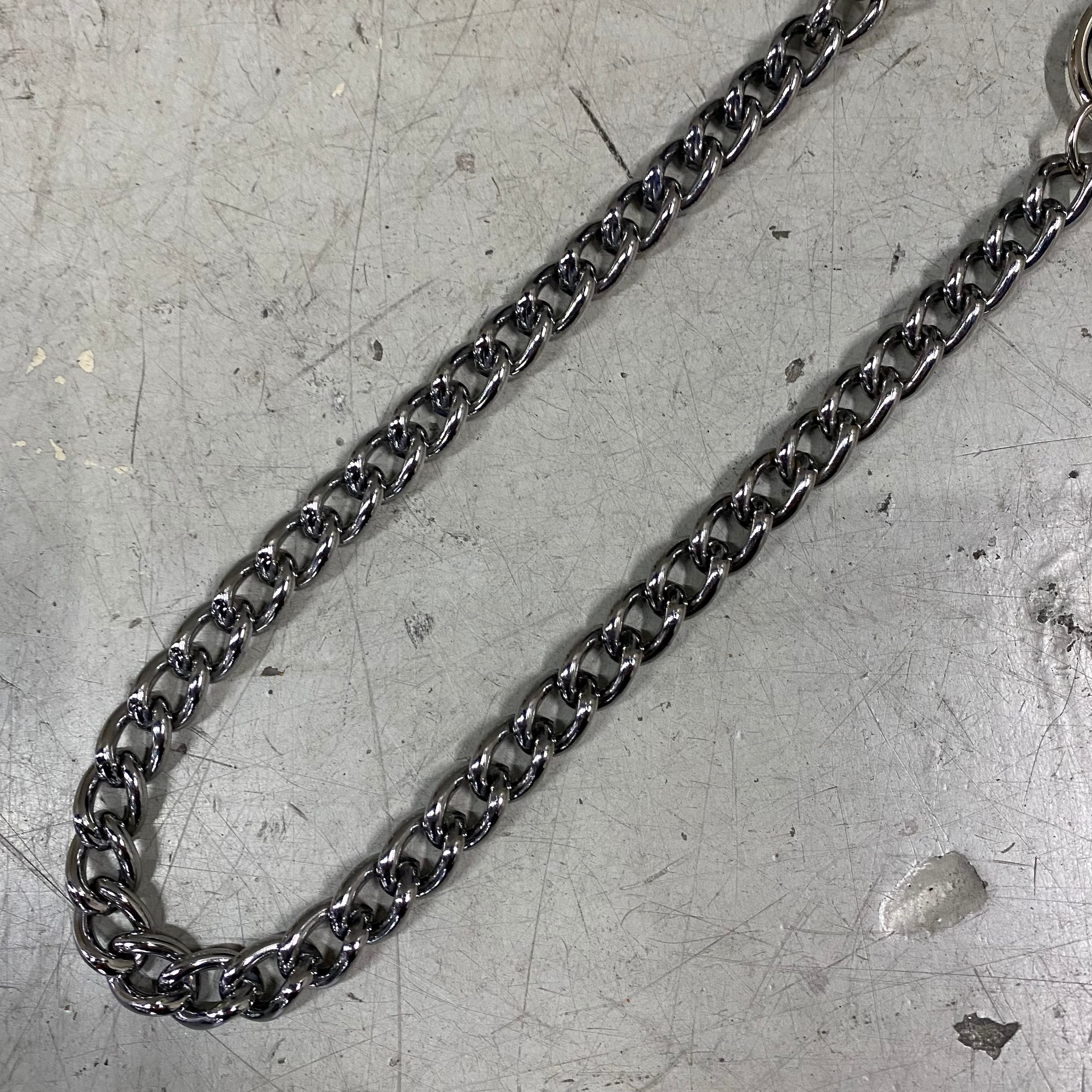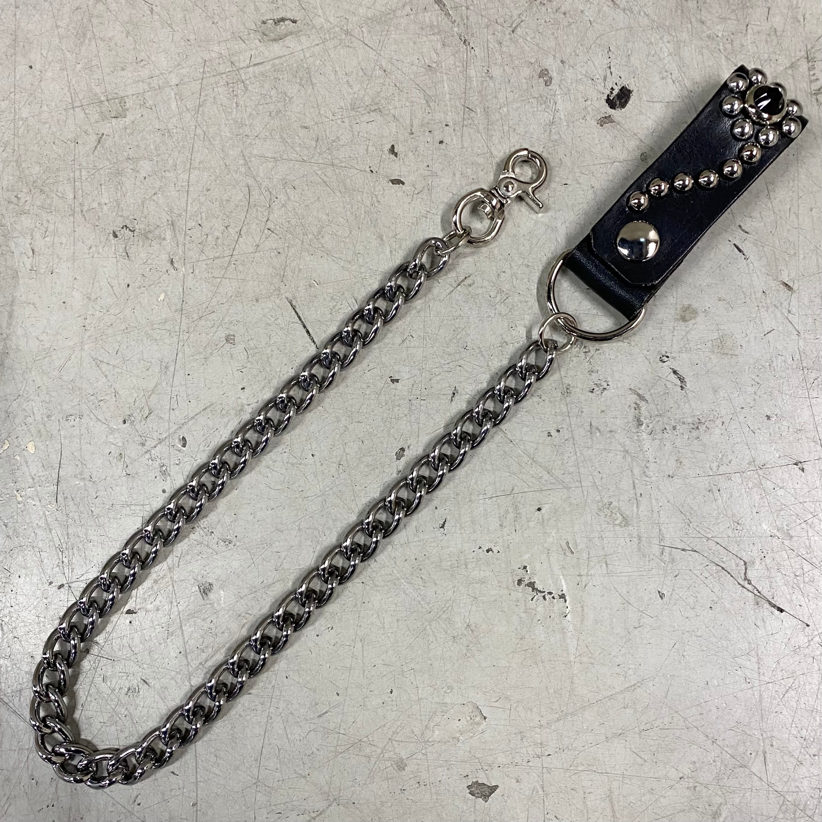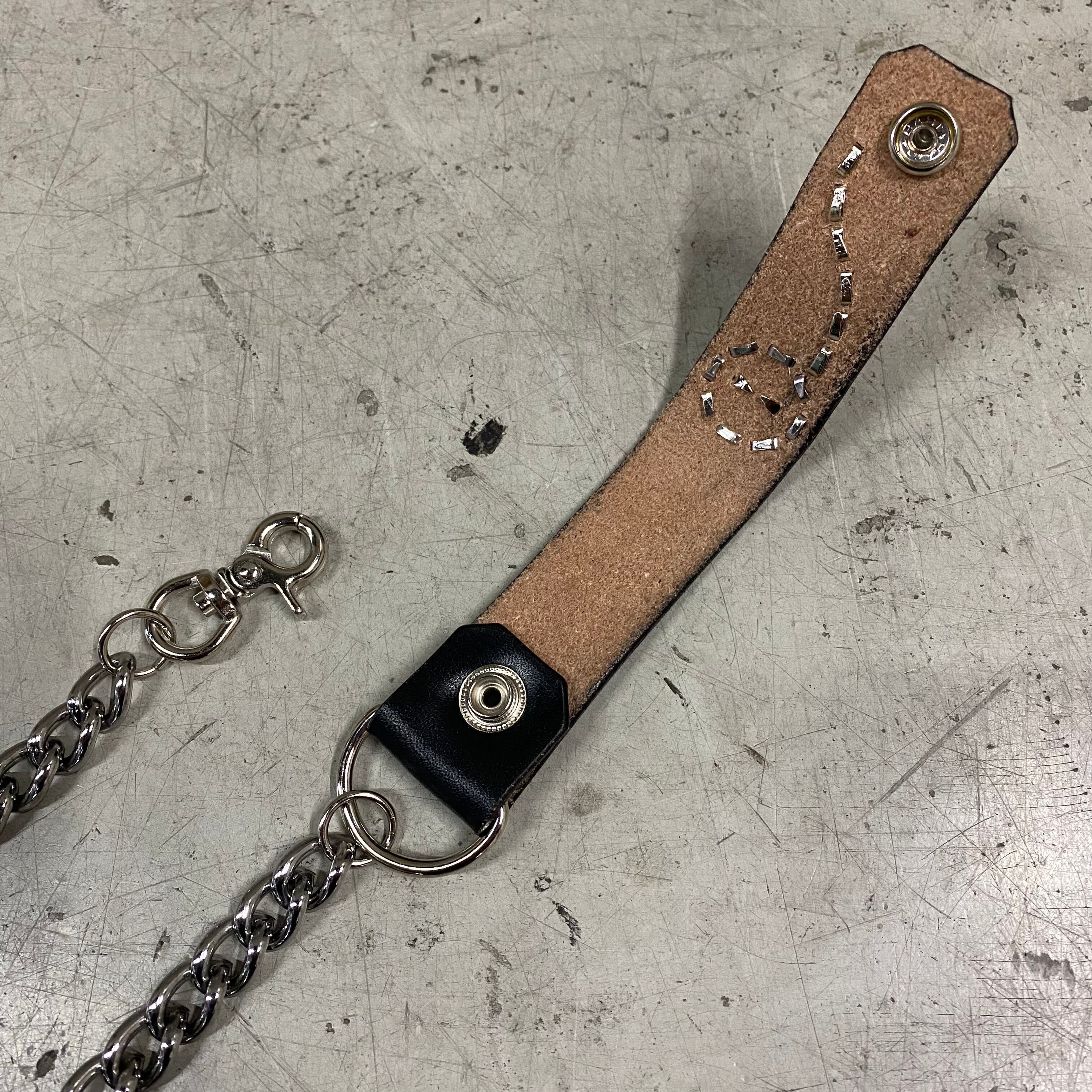 フラワースタッズを施したレザーベルトループ付きのウォレットチェーン。