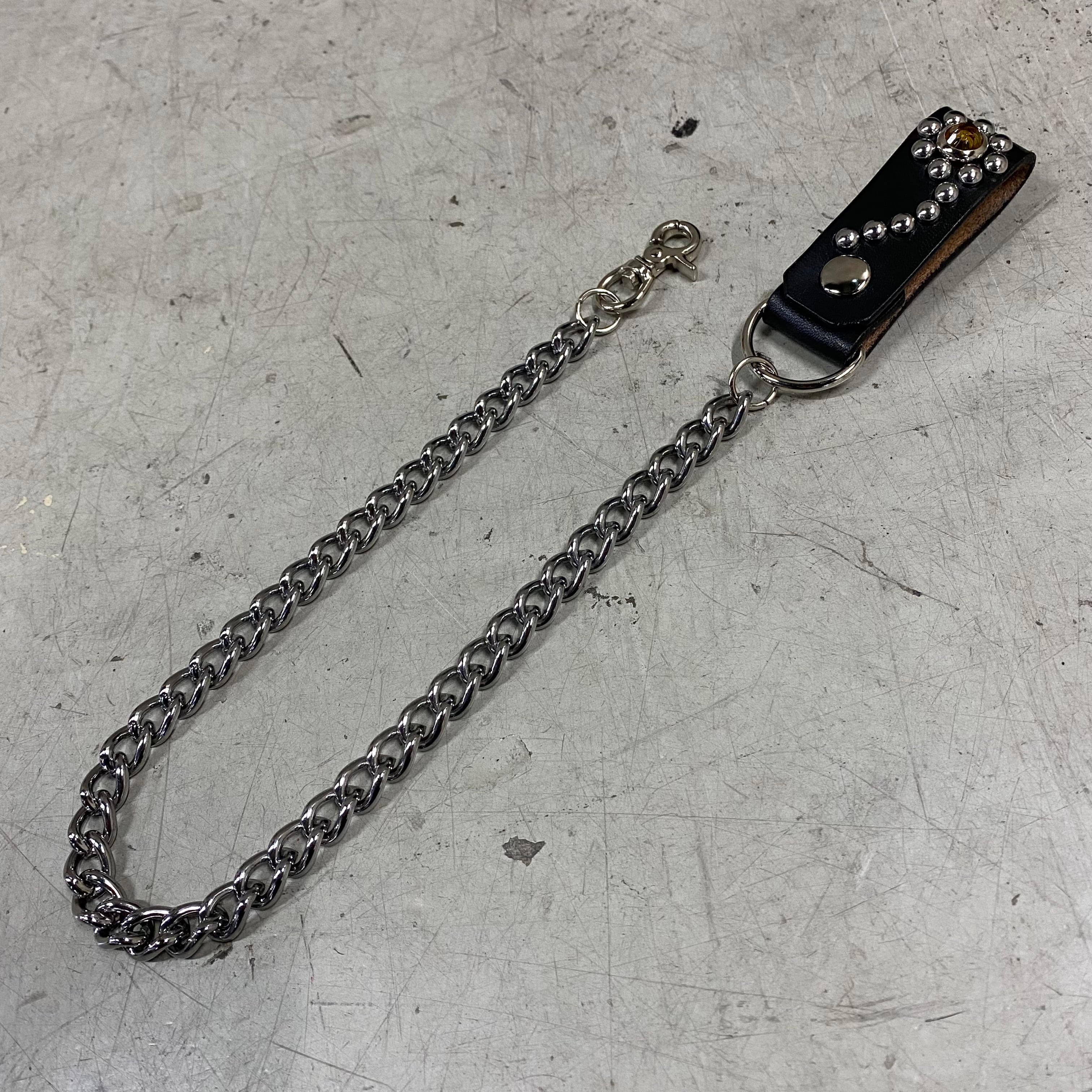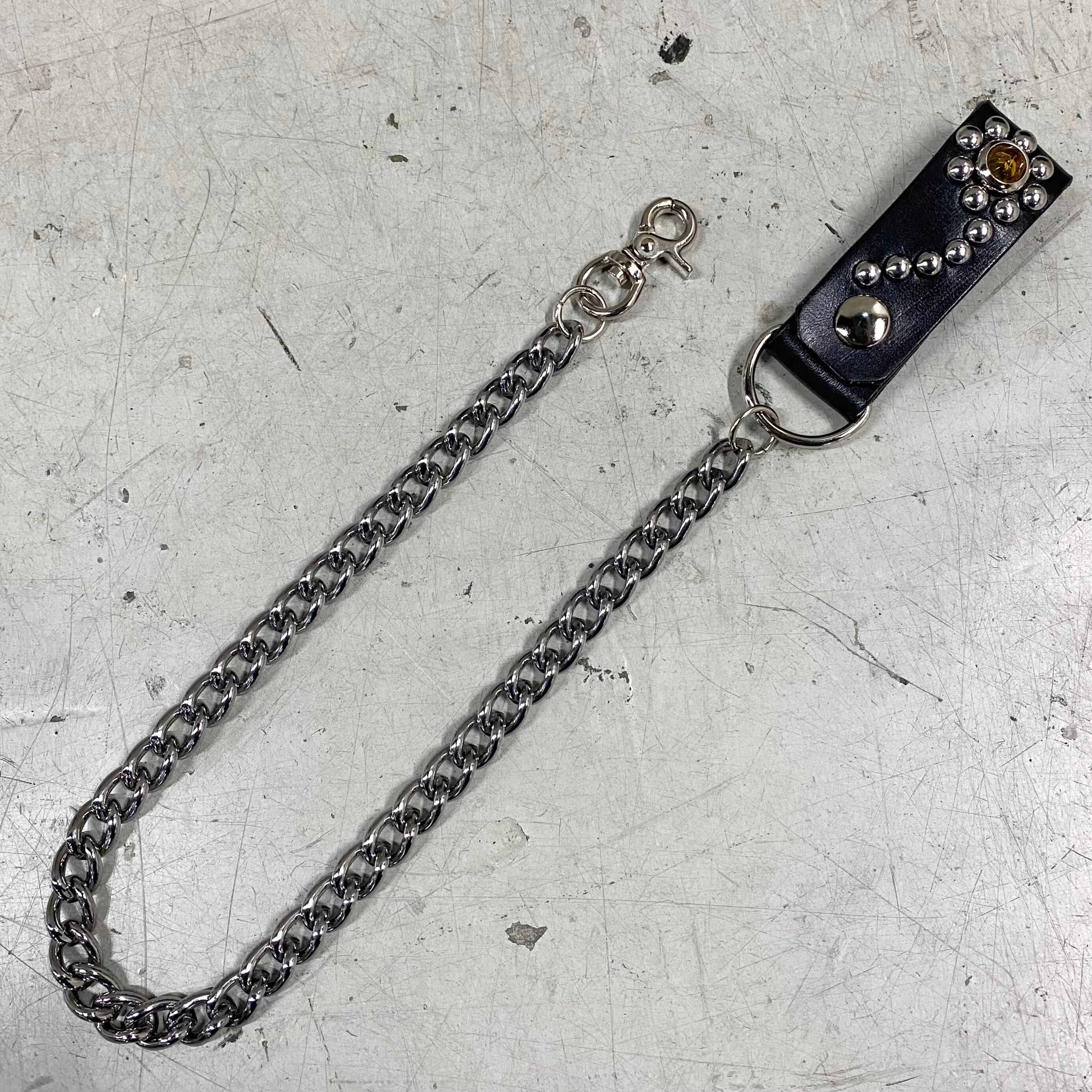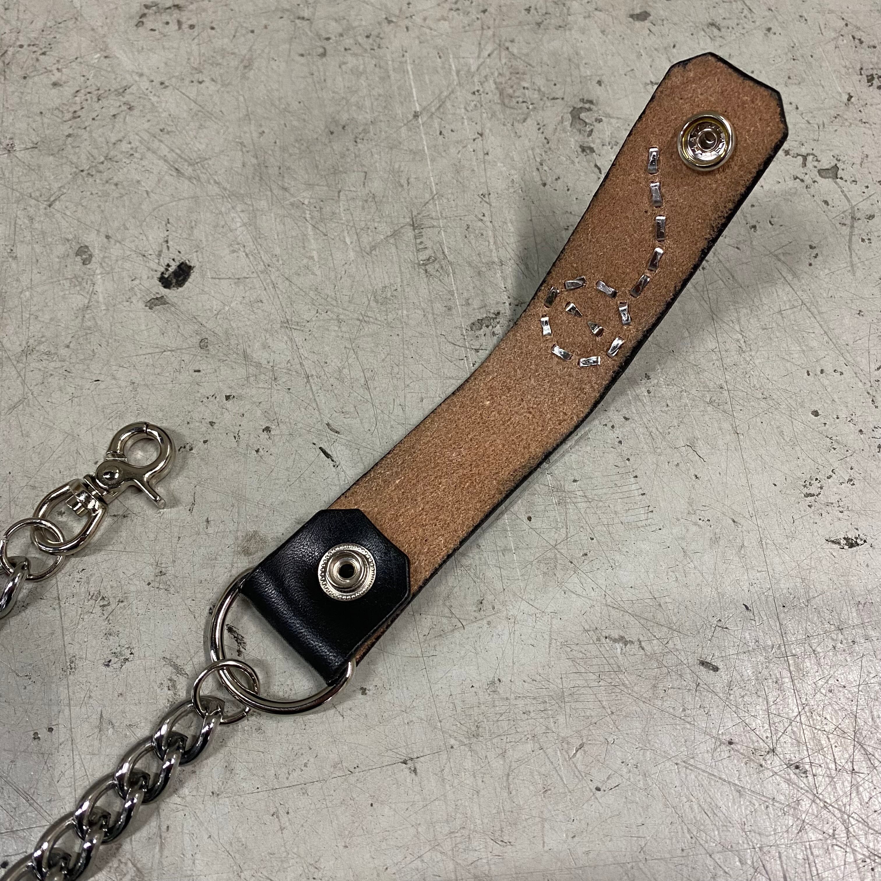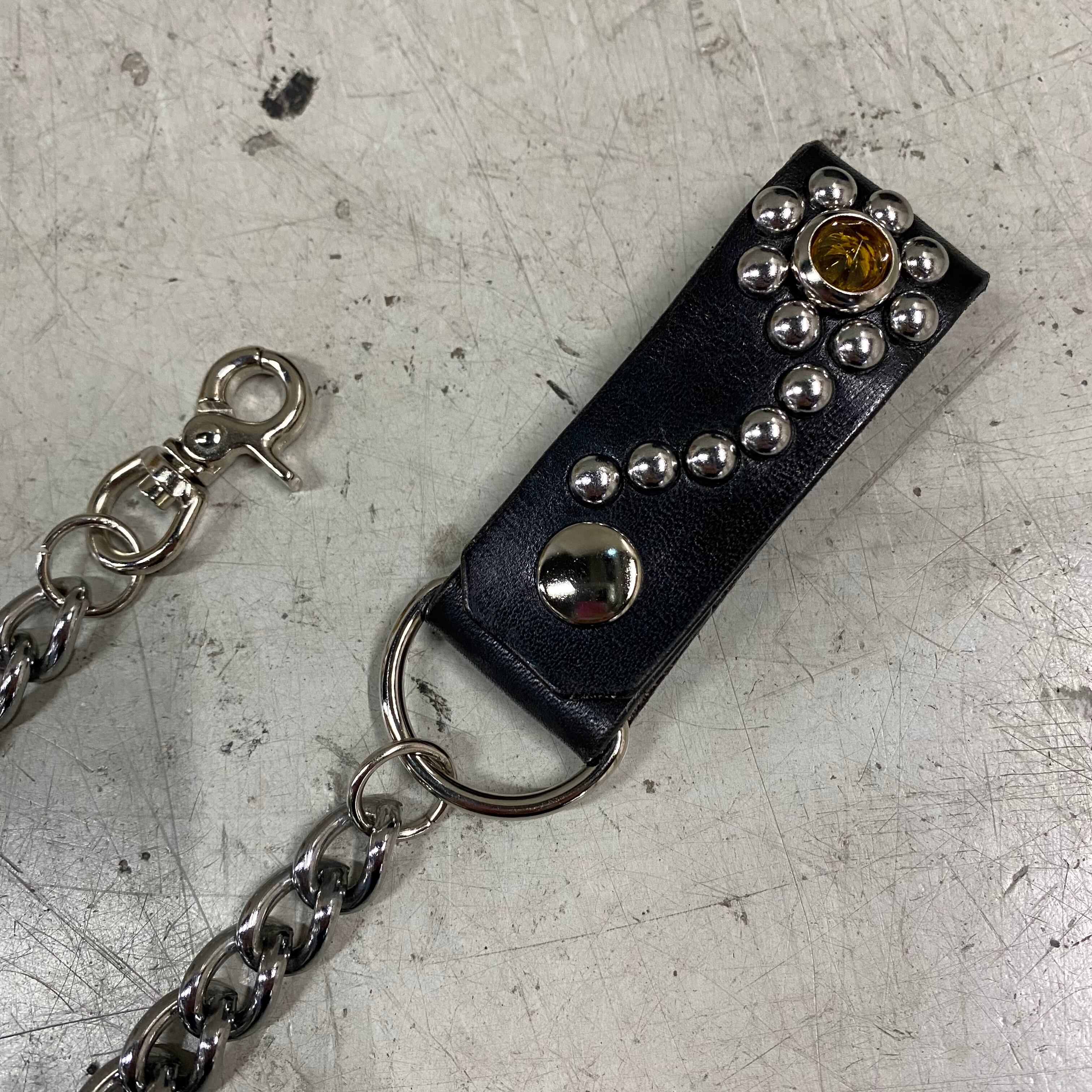 フラワースタッズを施したレザーベルトループ付きのウォレットチェーン。