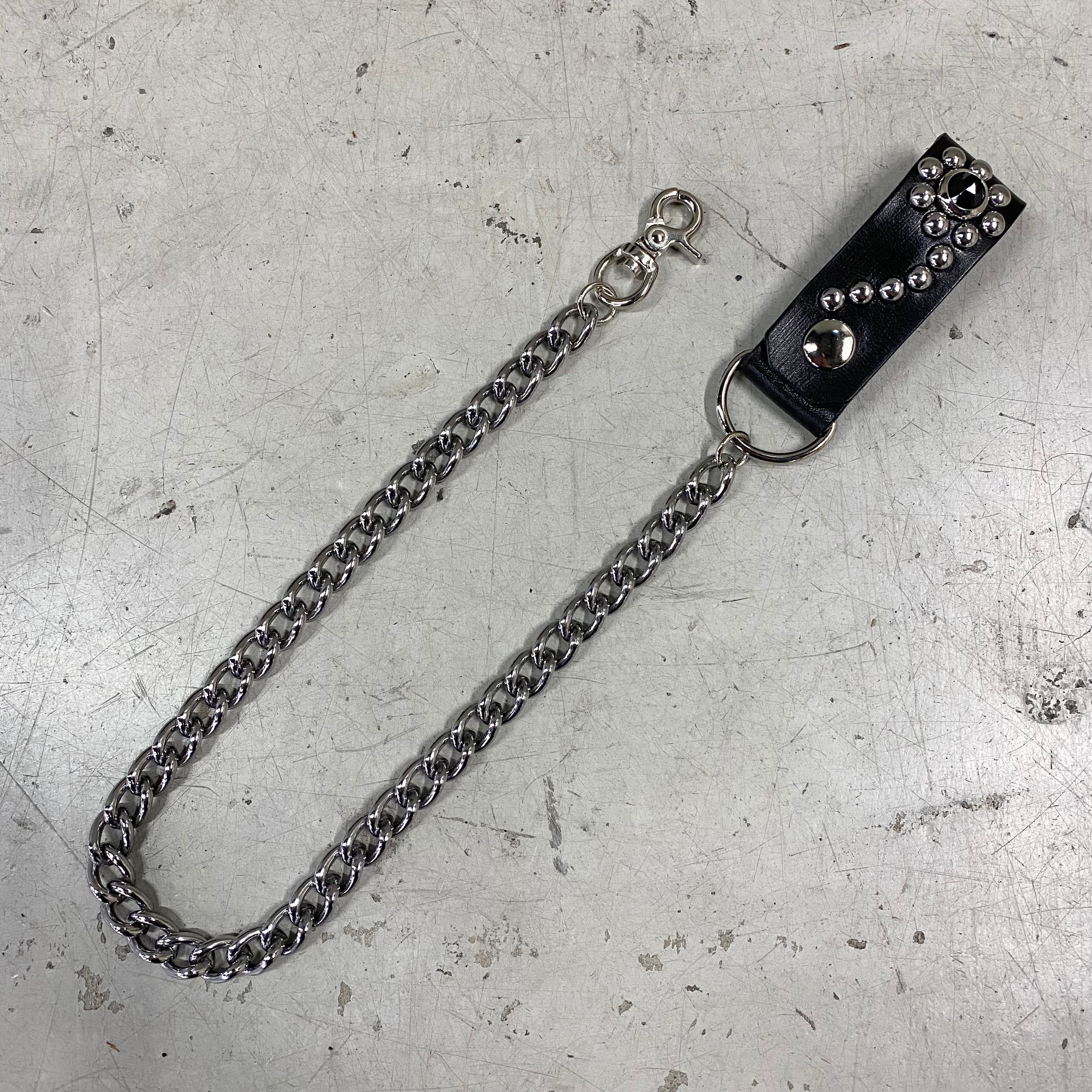 フラワースタッズを施したレザーベルトループ付きのウォレットチェーン。