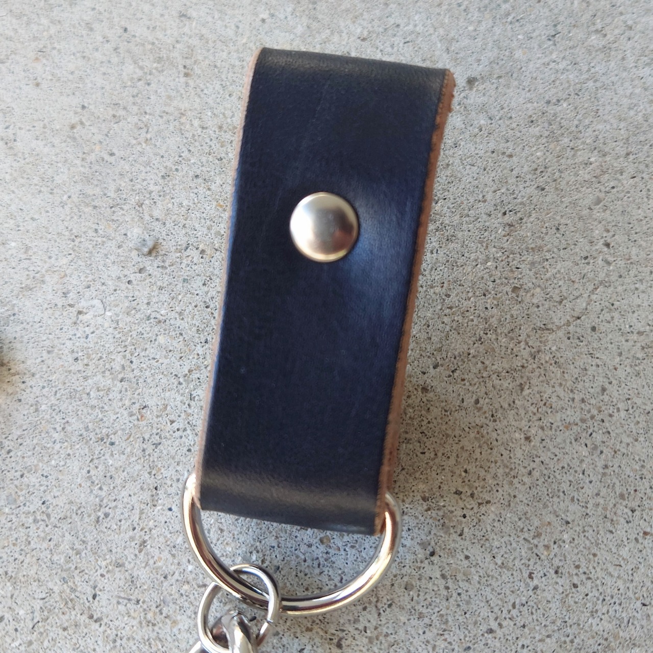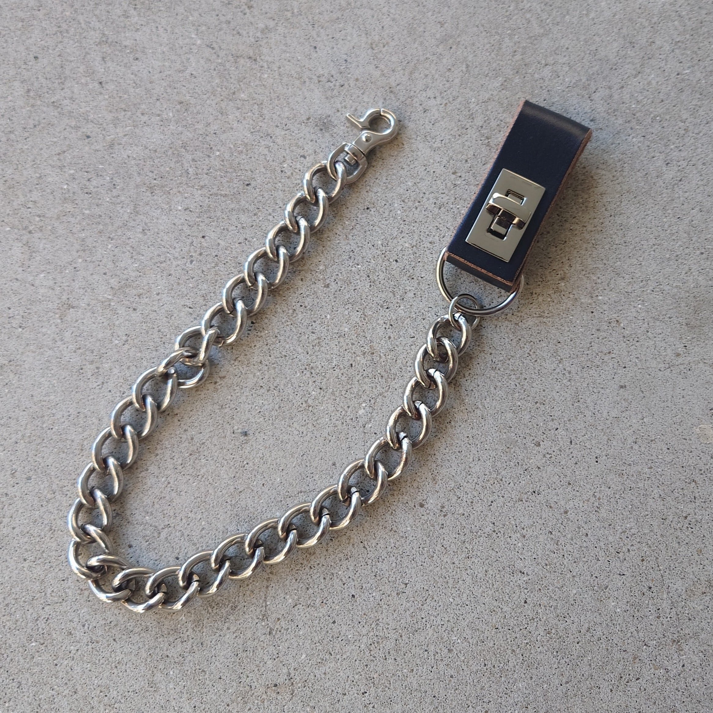 ヒネリ錠付きのベルトループに太めのメタルチェーンを合わせたデザイン。