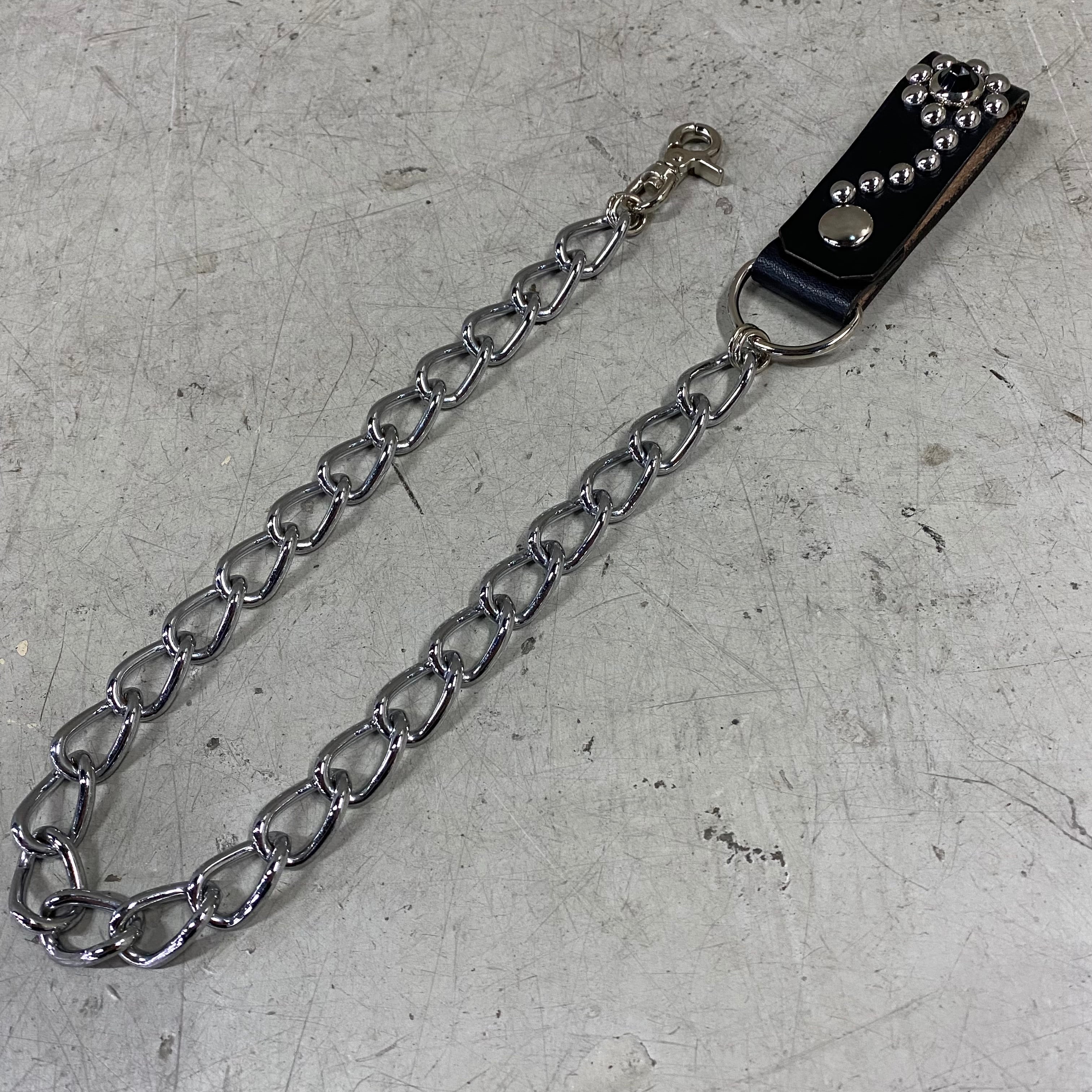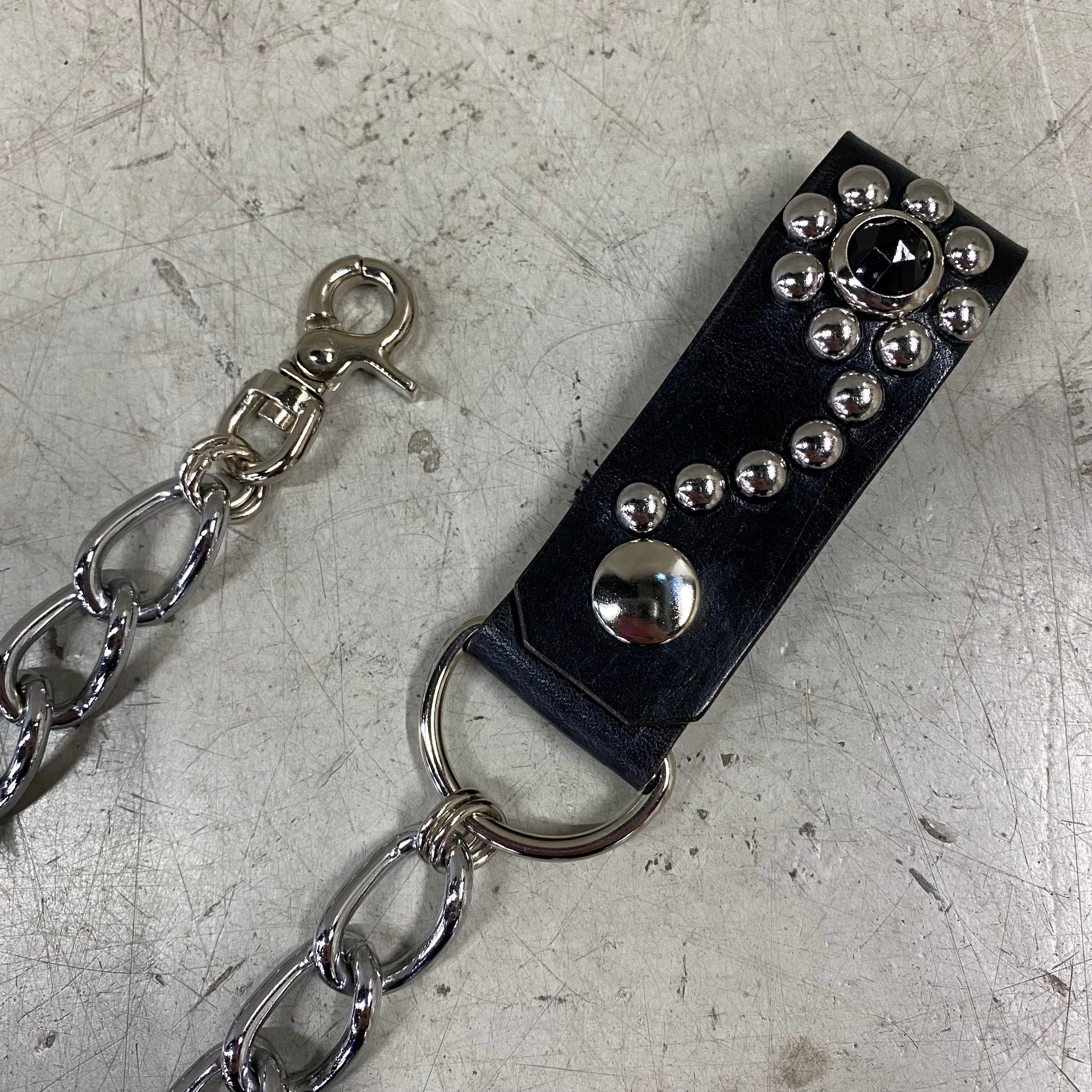 フラワースタッズを施したレザーベルトループ付きのウォレットチェーン。