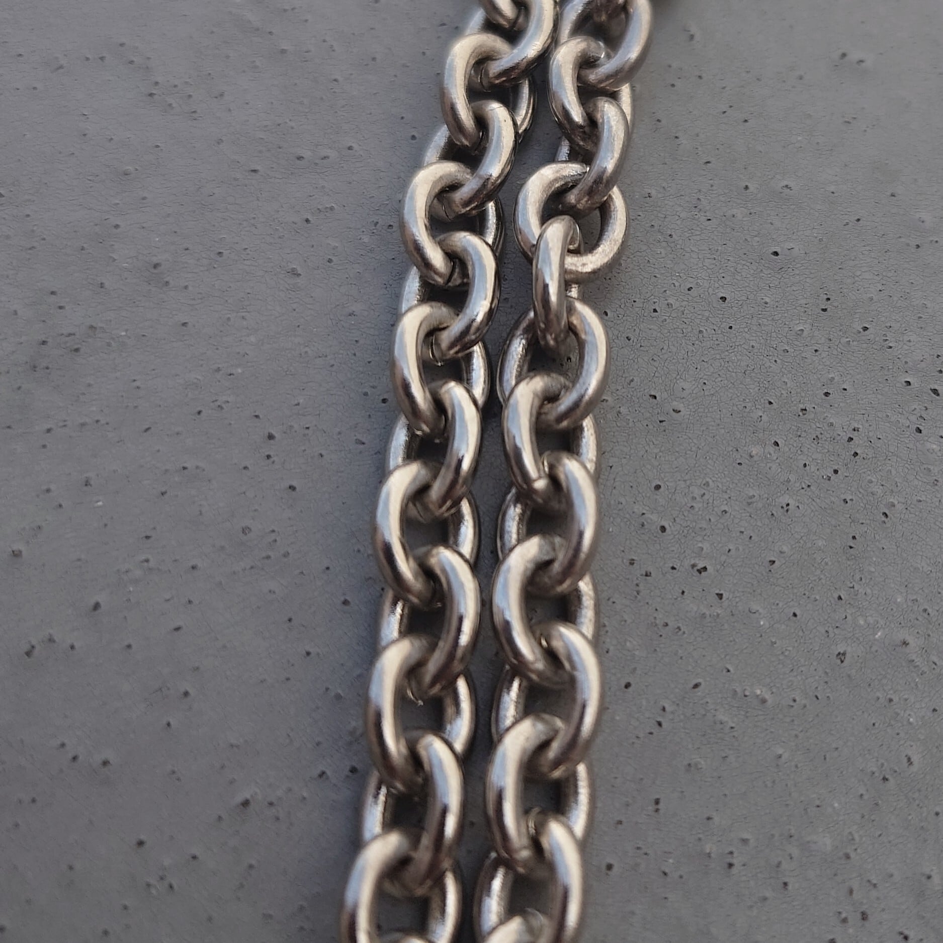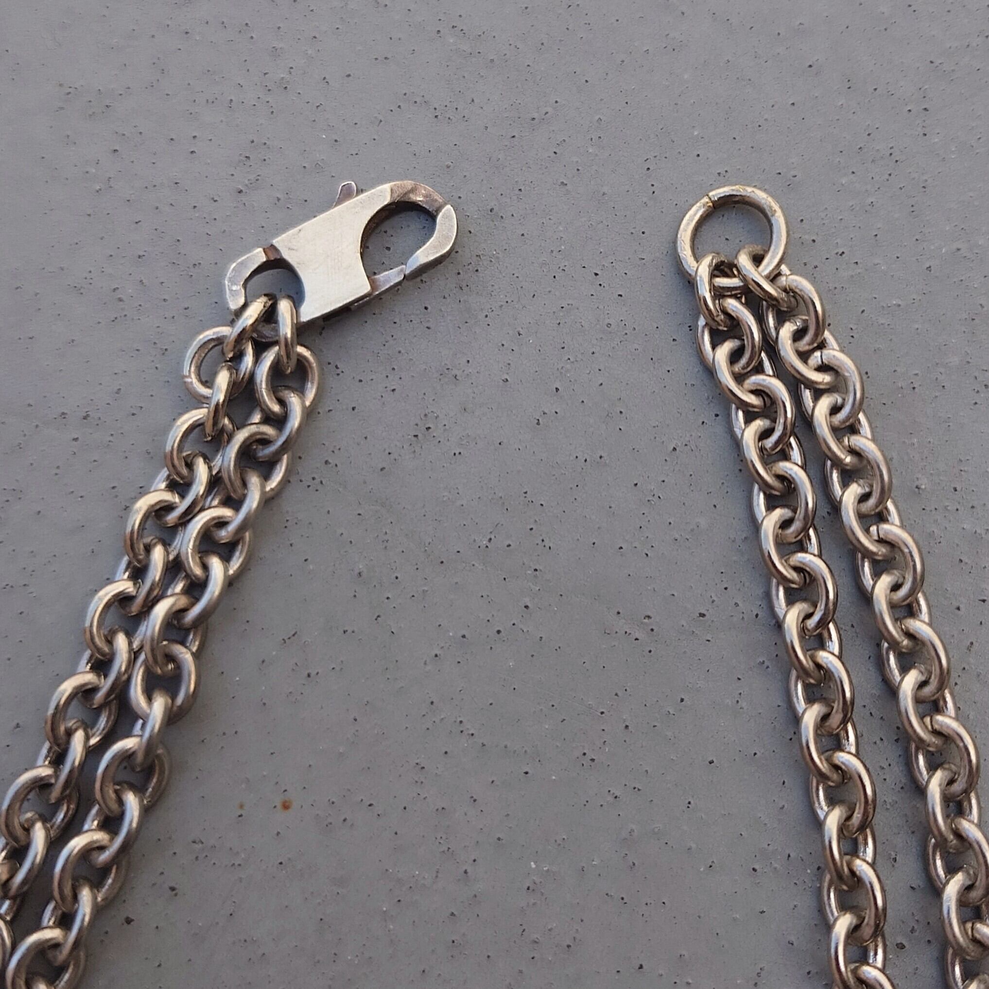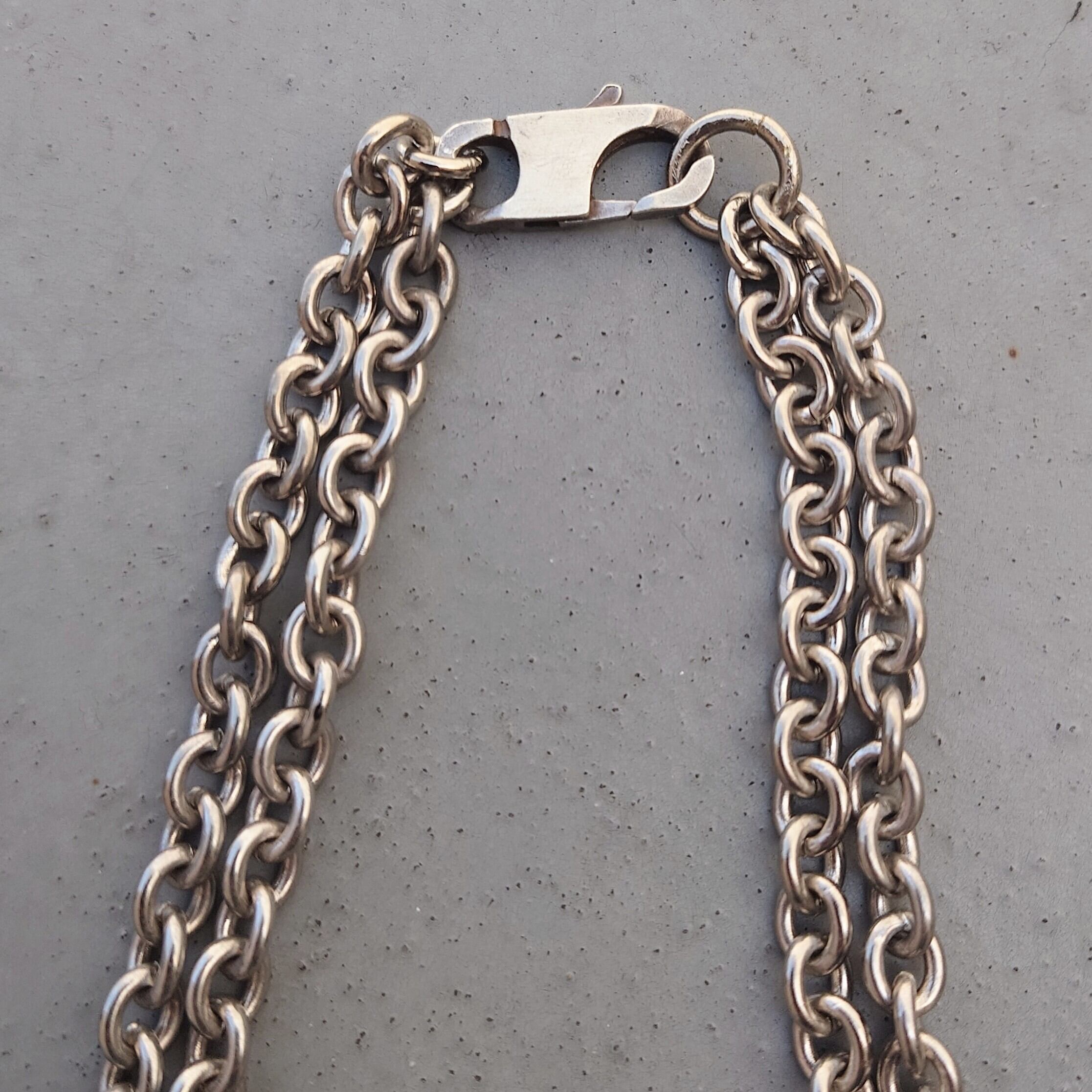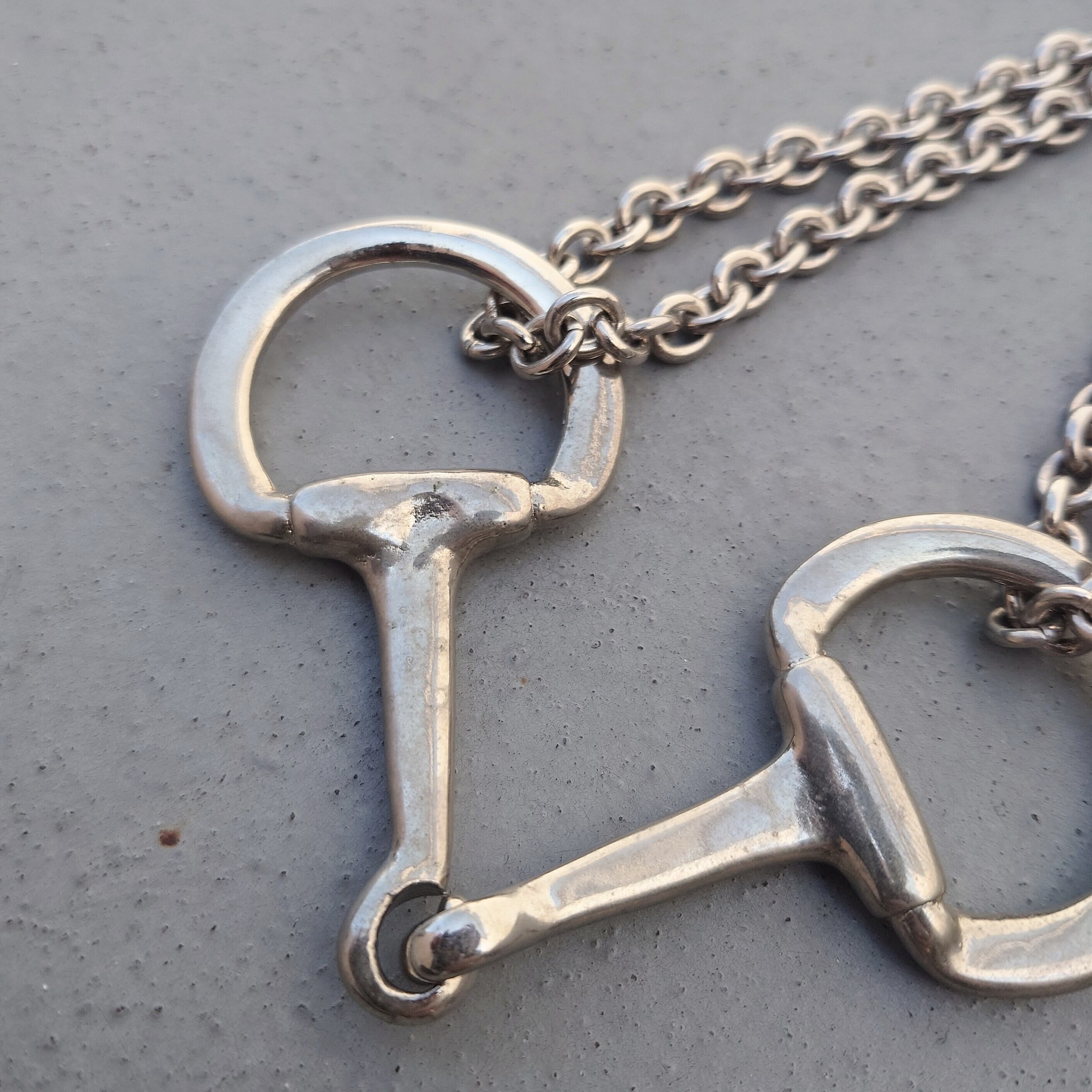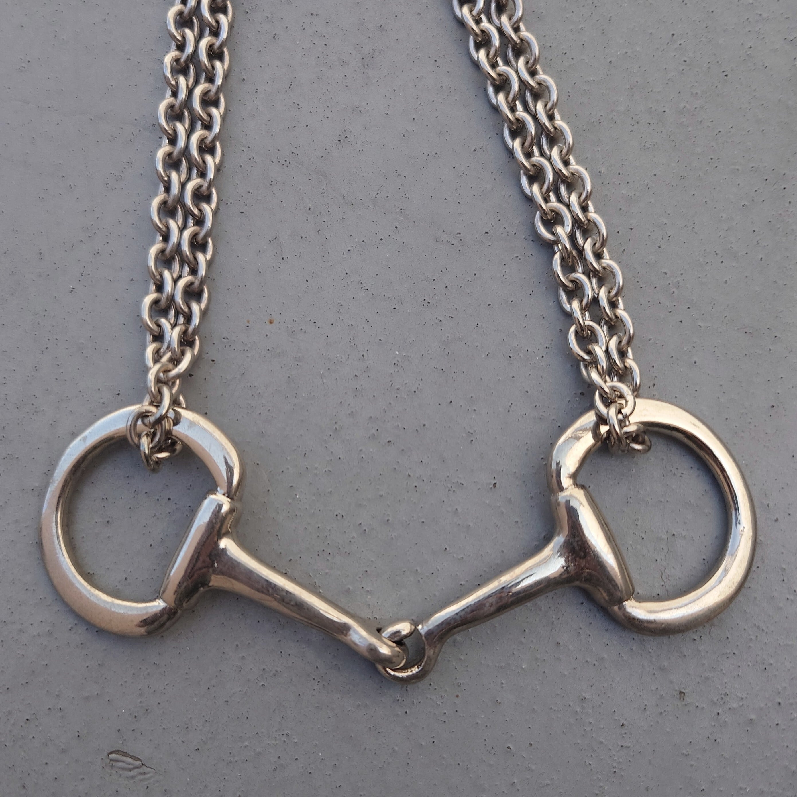 特大のホースビット金具に太めのあずきチェーンをダブルで繋いだボリュームのあるデザイン。