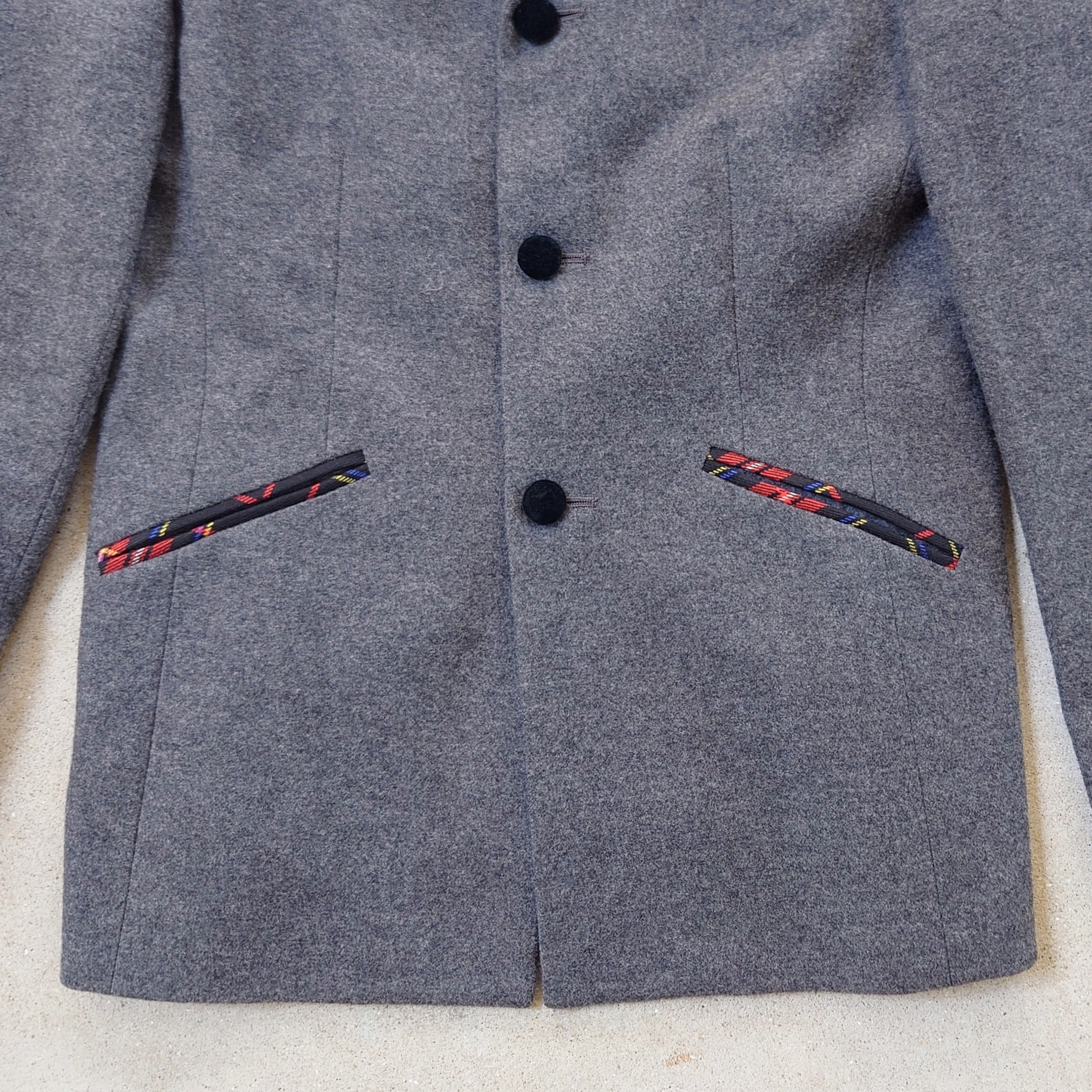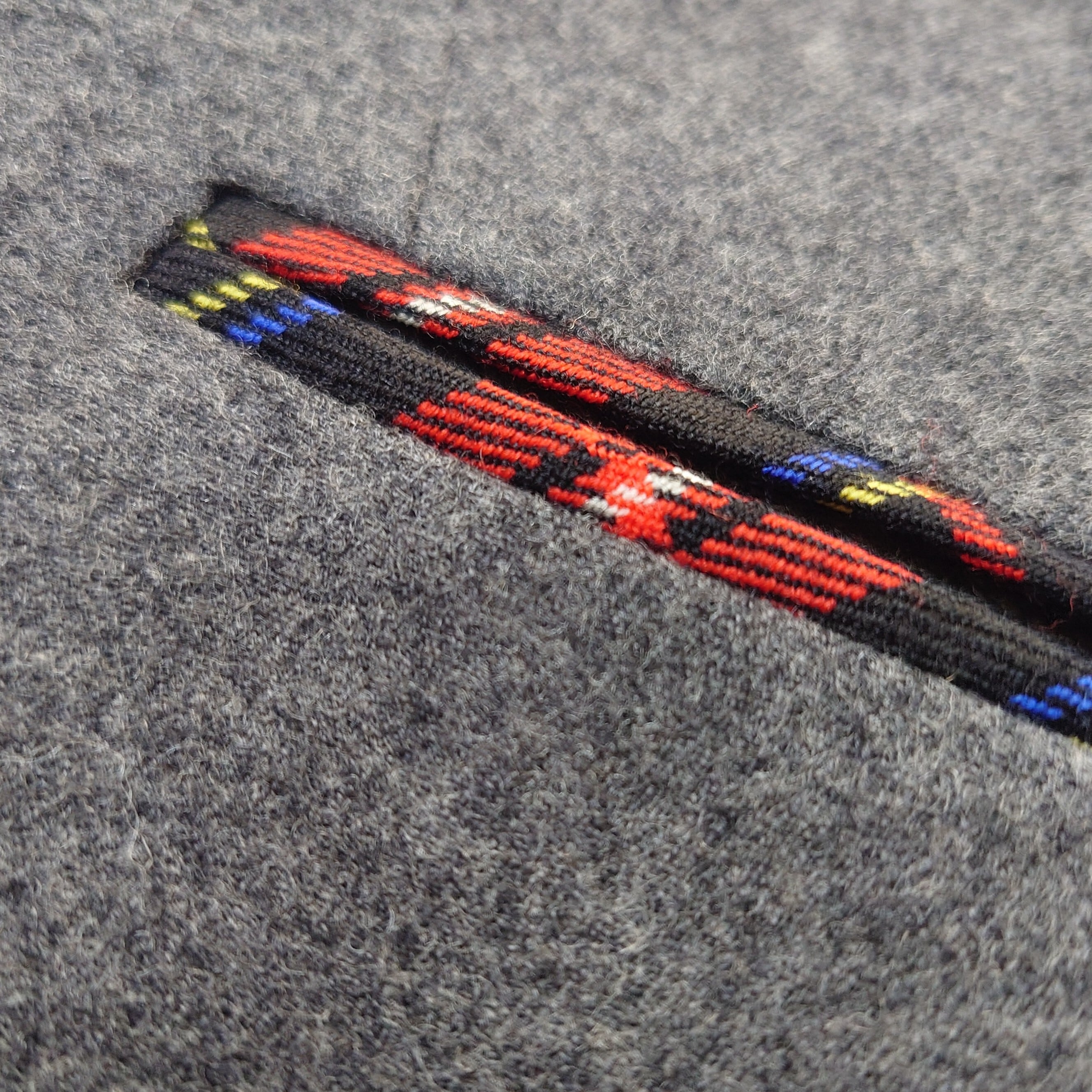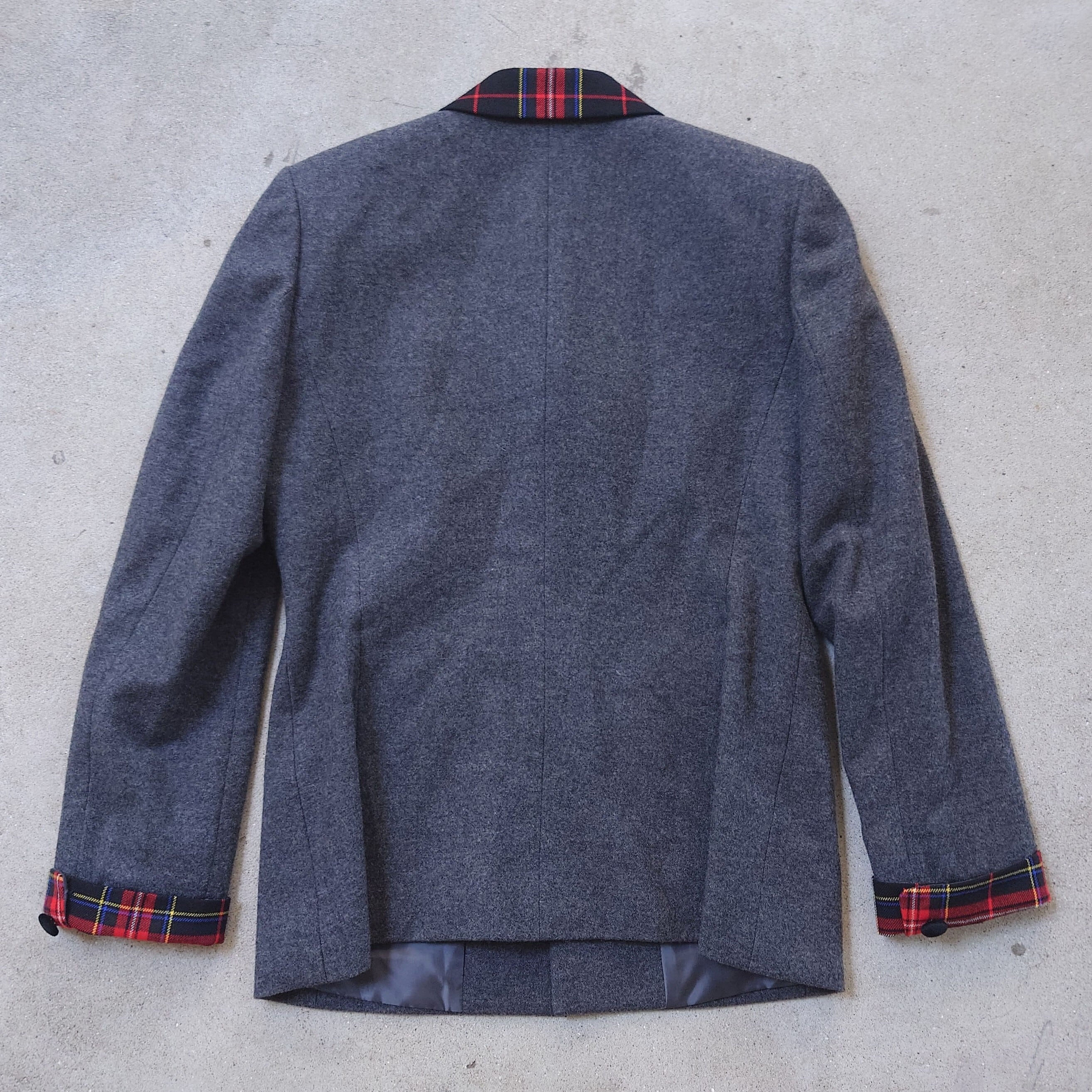 グレーのウール地とタータンチェックのコントラストが目を引くデザイン。