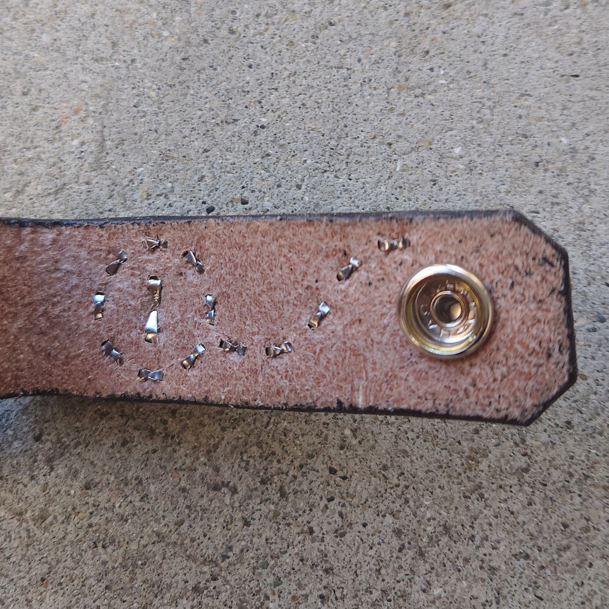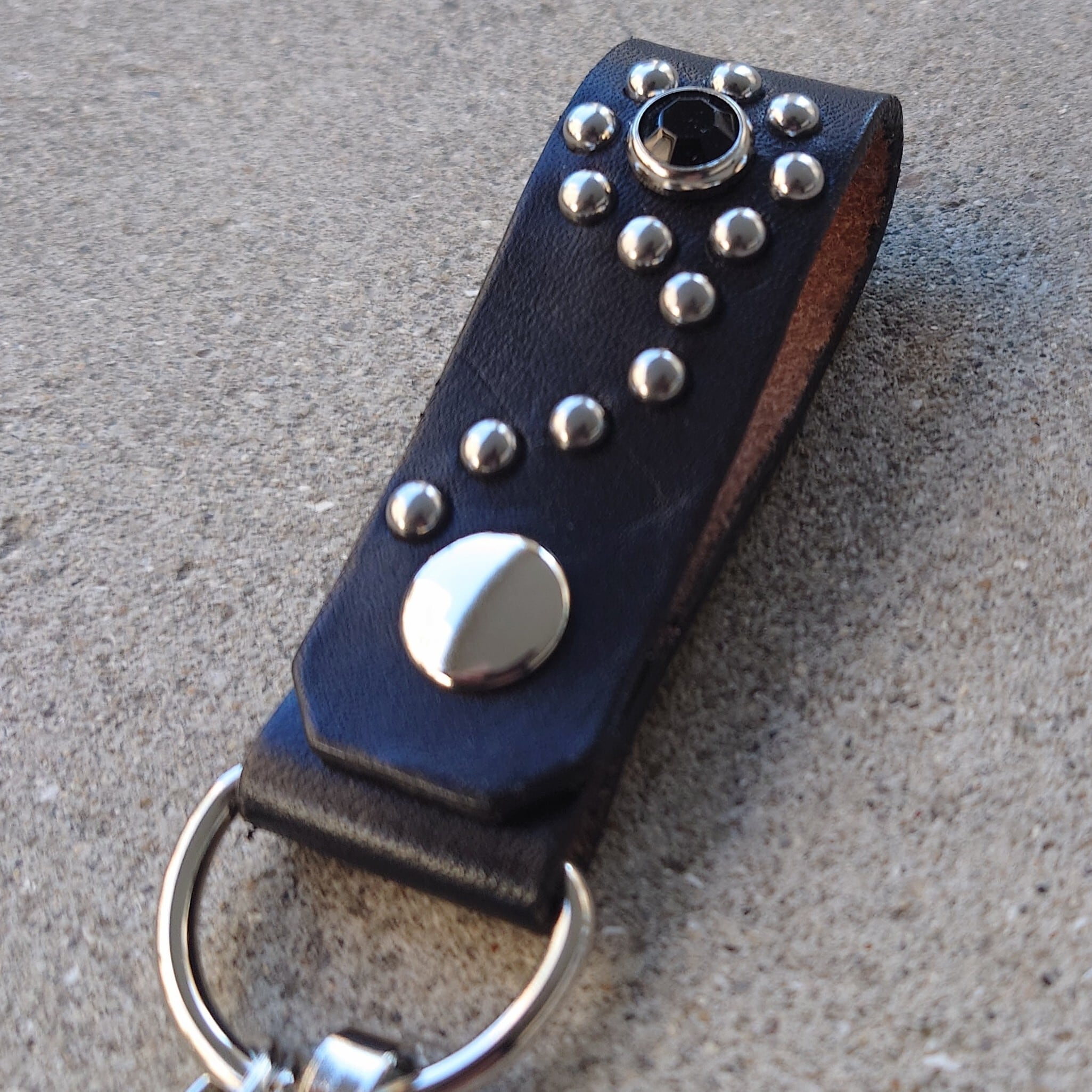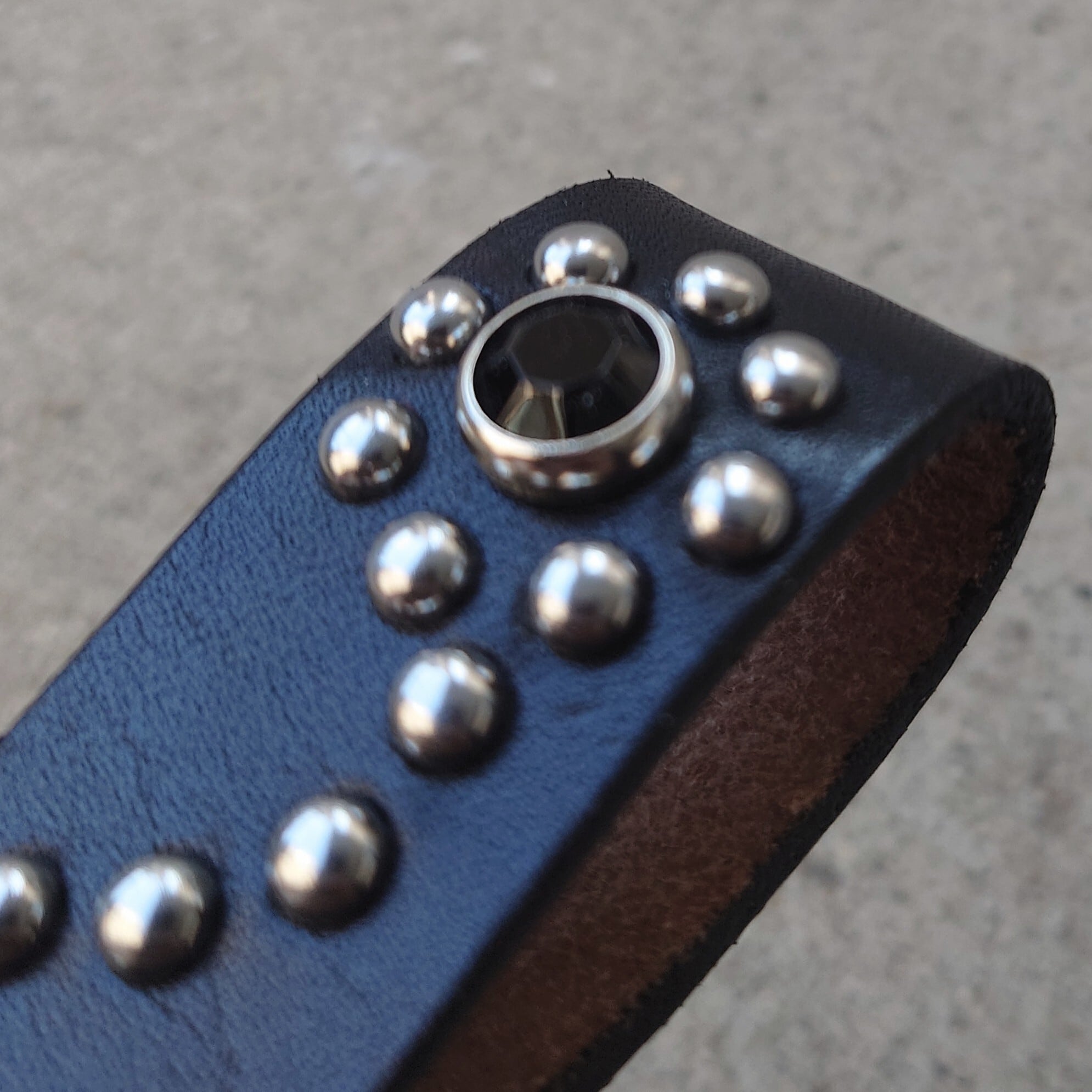 黒染めを施した牛革にフラワーモチーフのスタッズを付けたベルトループ。