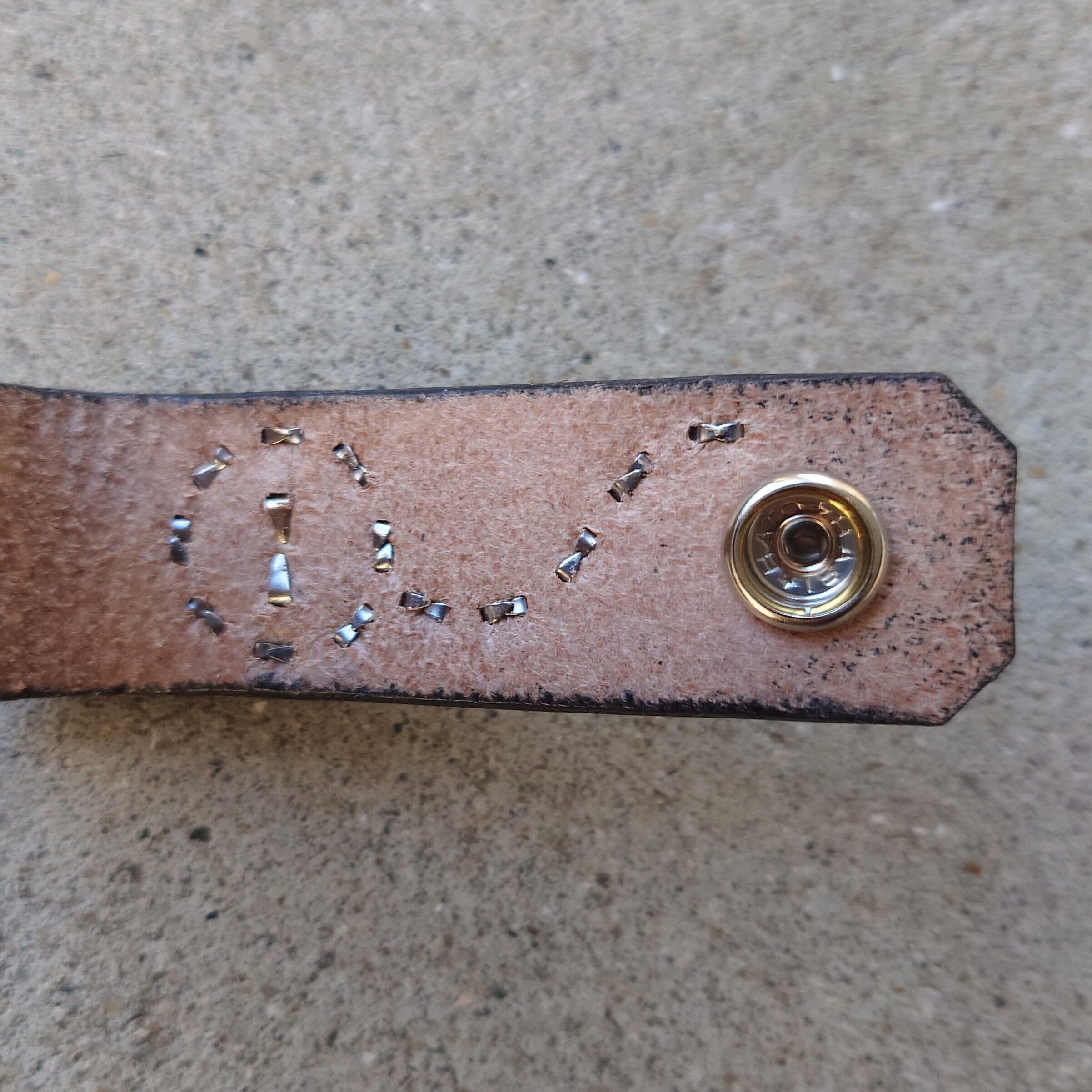 黒染めを施した牛革にフラワーモチーフのスタッズを付けたベルトループ。