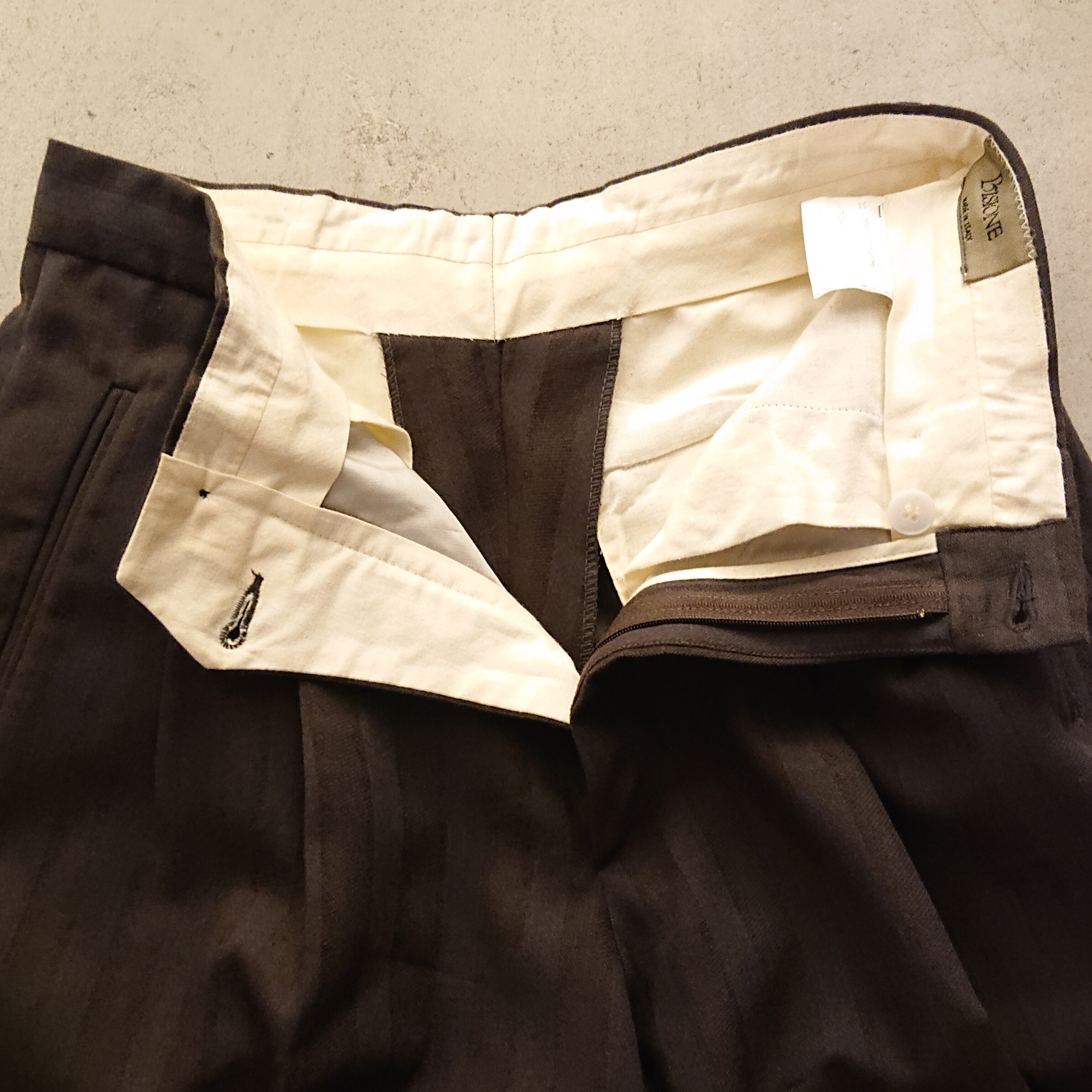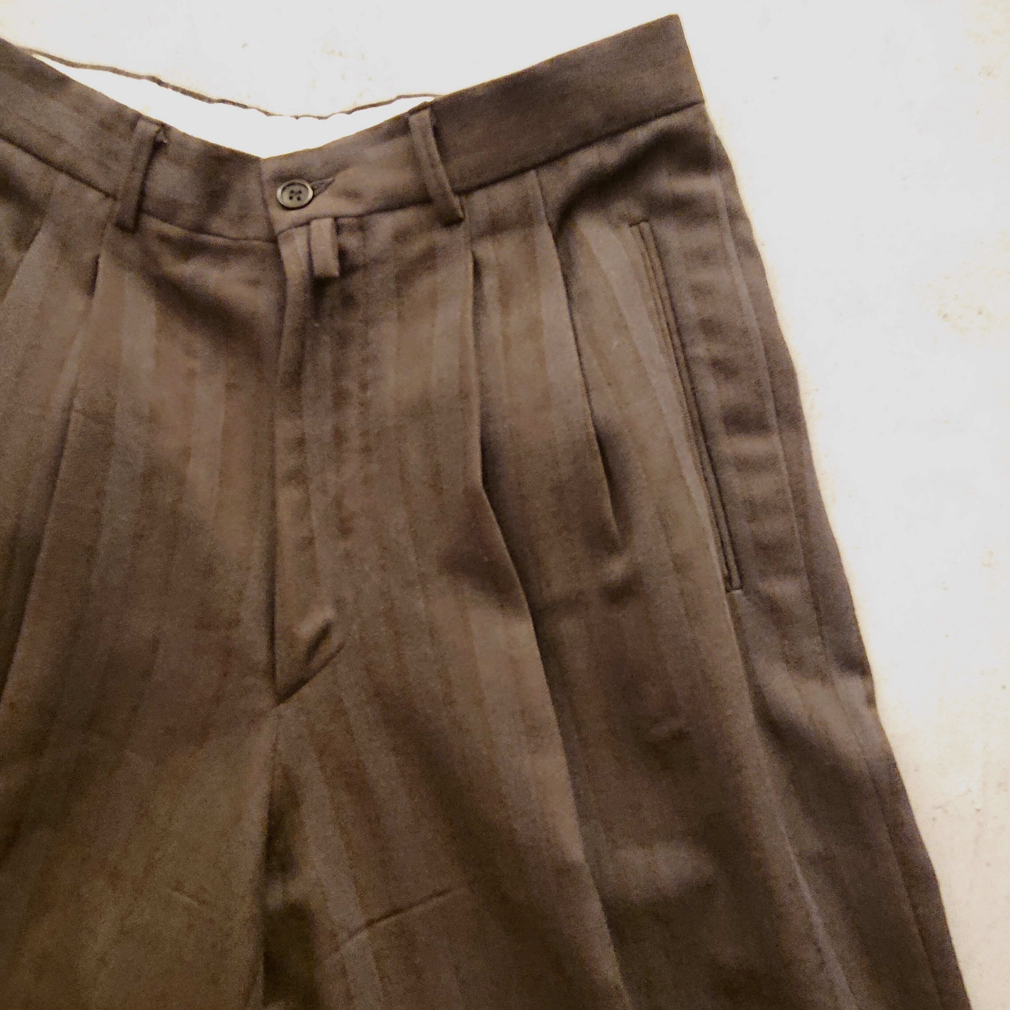 グレーとブラウンのワイドストライプスラックス。