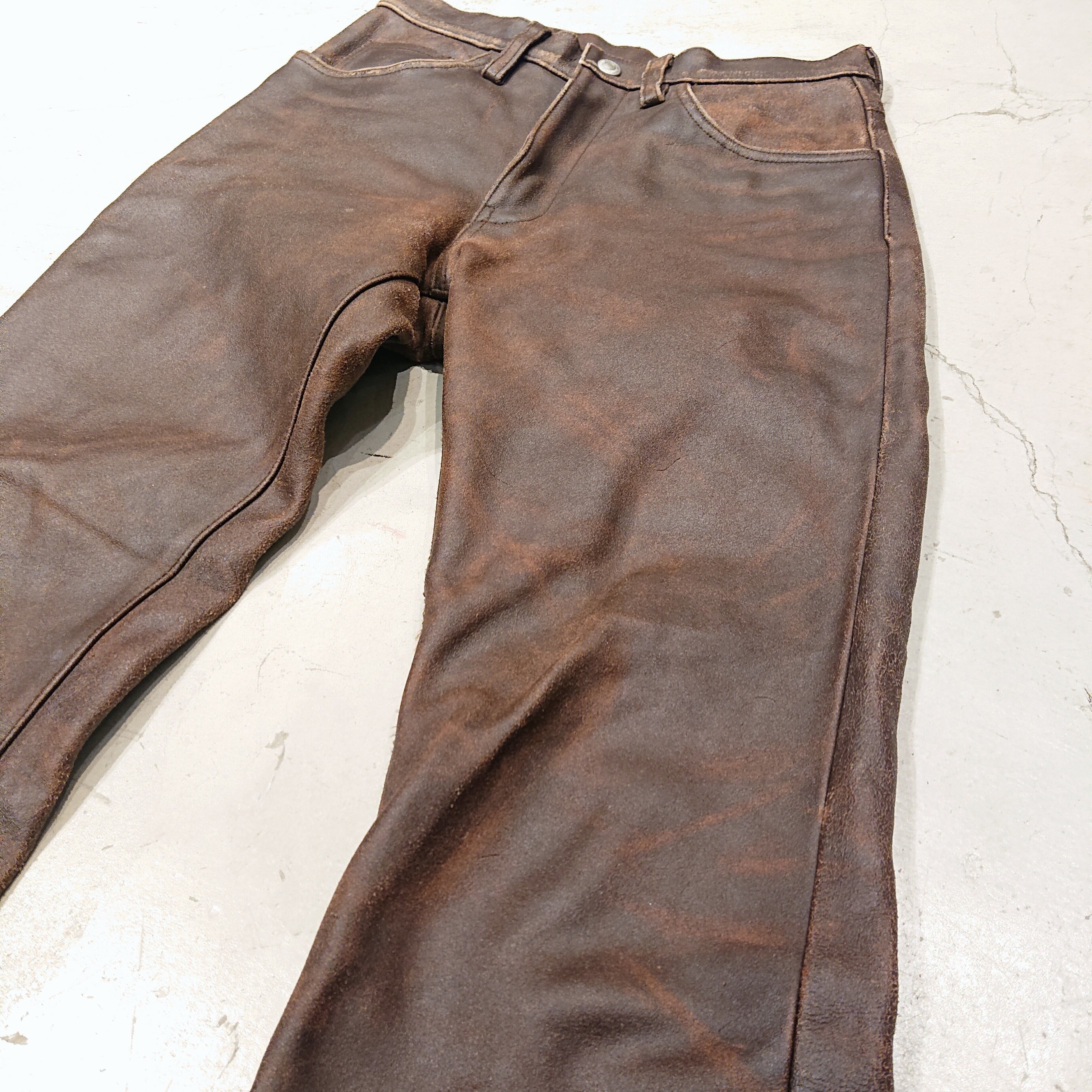 ストレートジーンズの型が落とし込まれており、レザーでありながら合わせやすいデザインです。