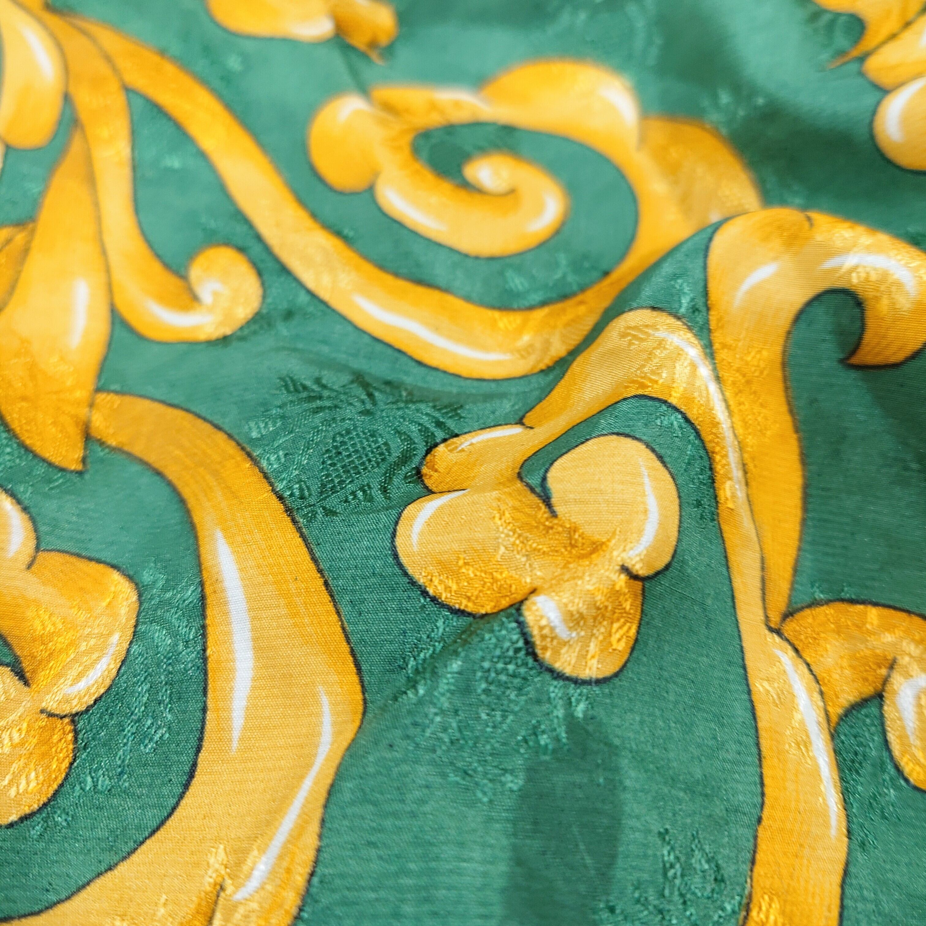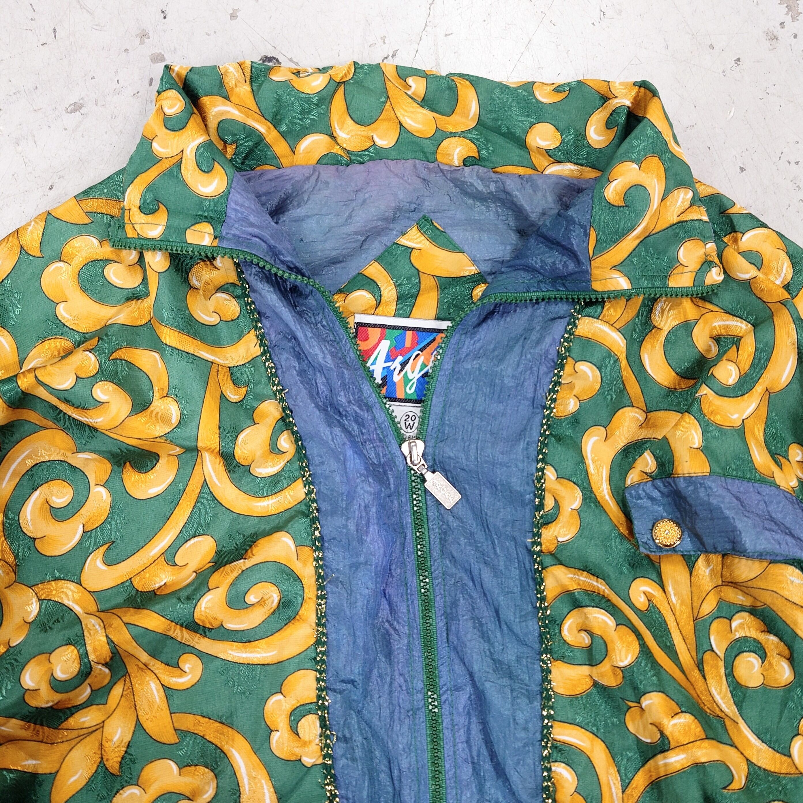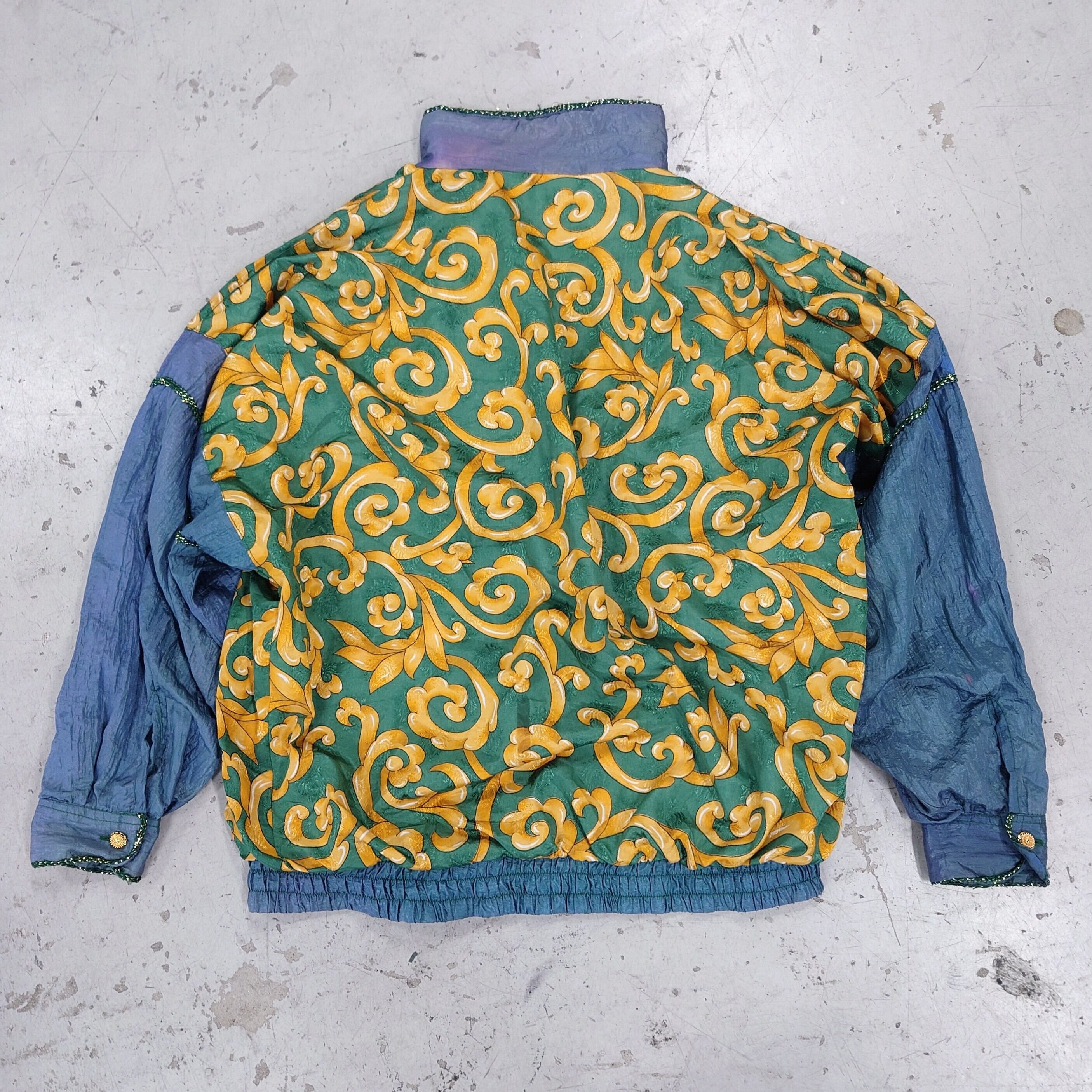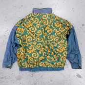 荘厳なアラベスクの柄と金ボタン装飾と対比するようなスポーティなシルエットがギャップのある一着。