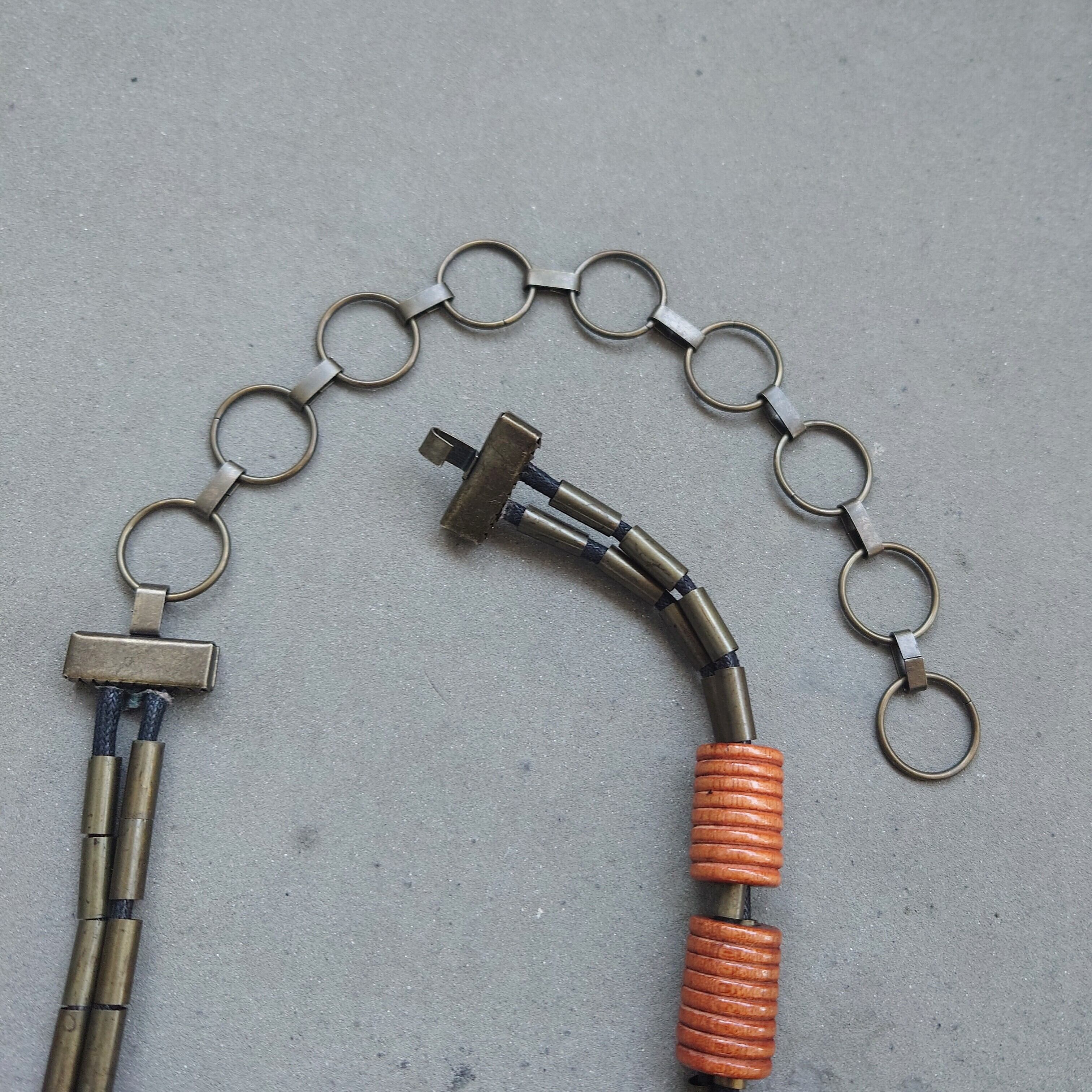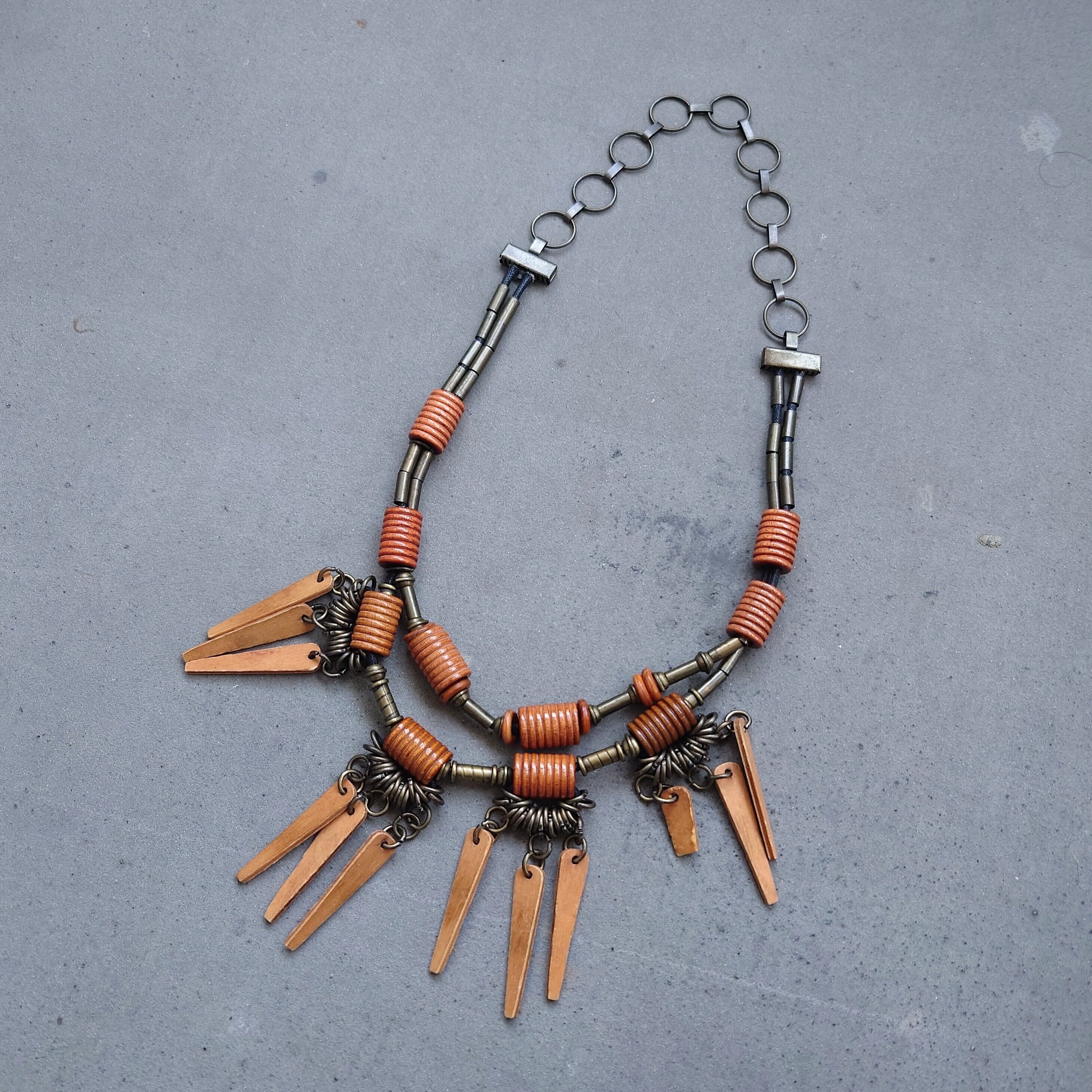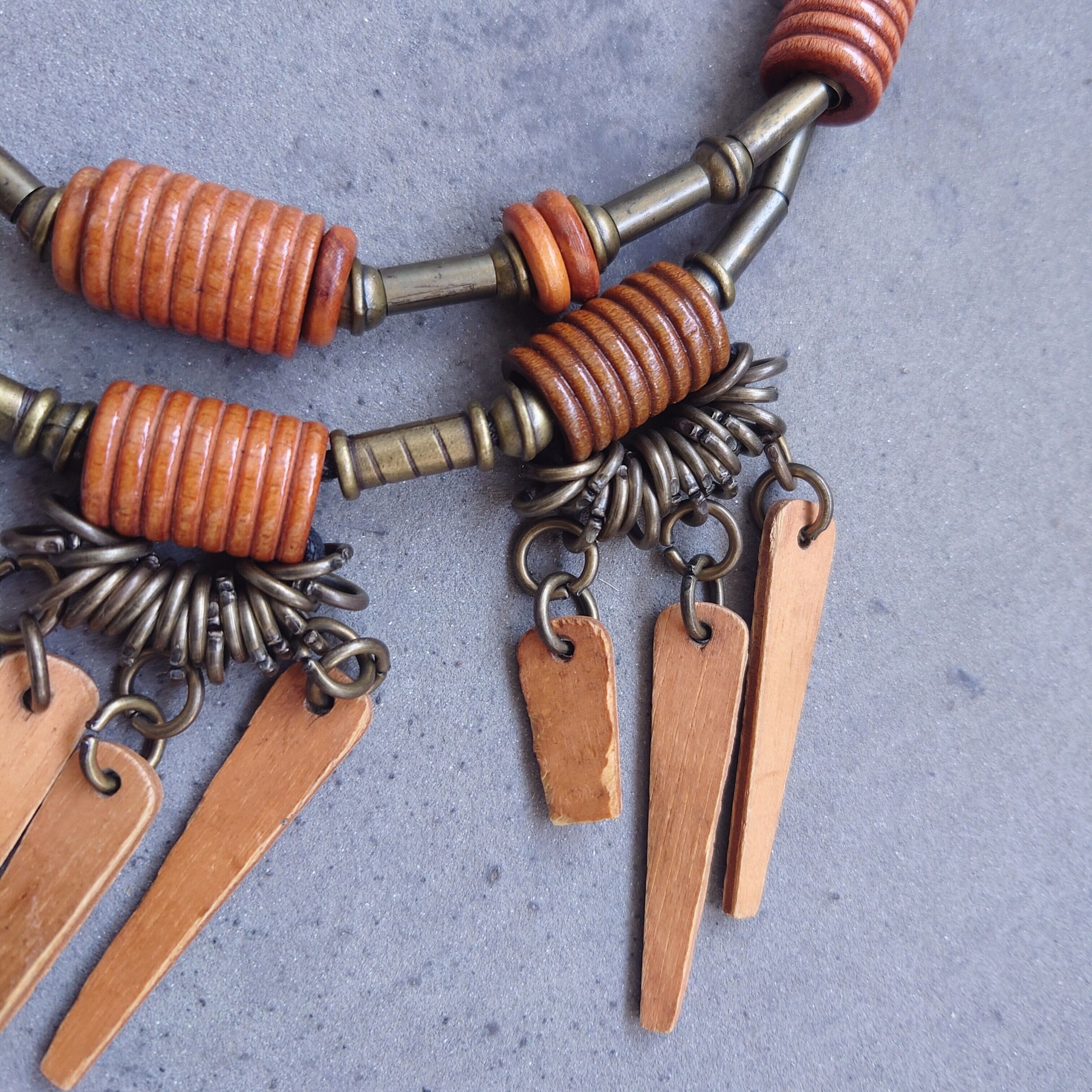 木製パーツとアンティークゴールドのカンや筒の組み合わさったボリューミーなデザイン。