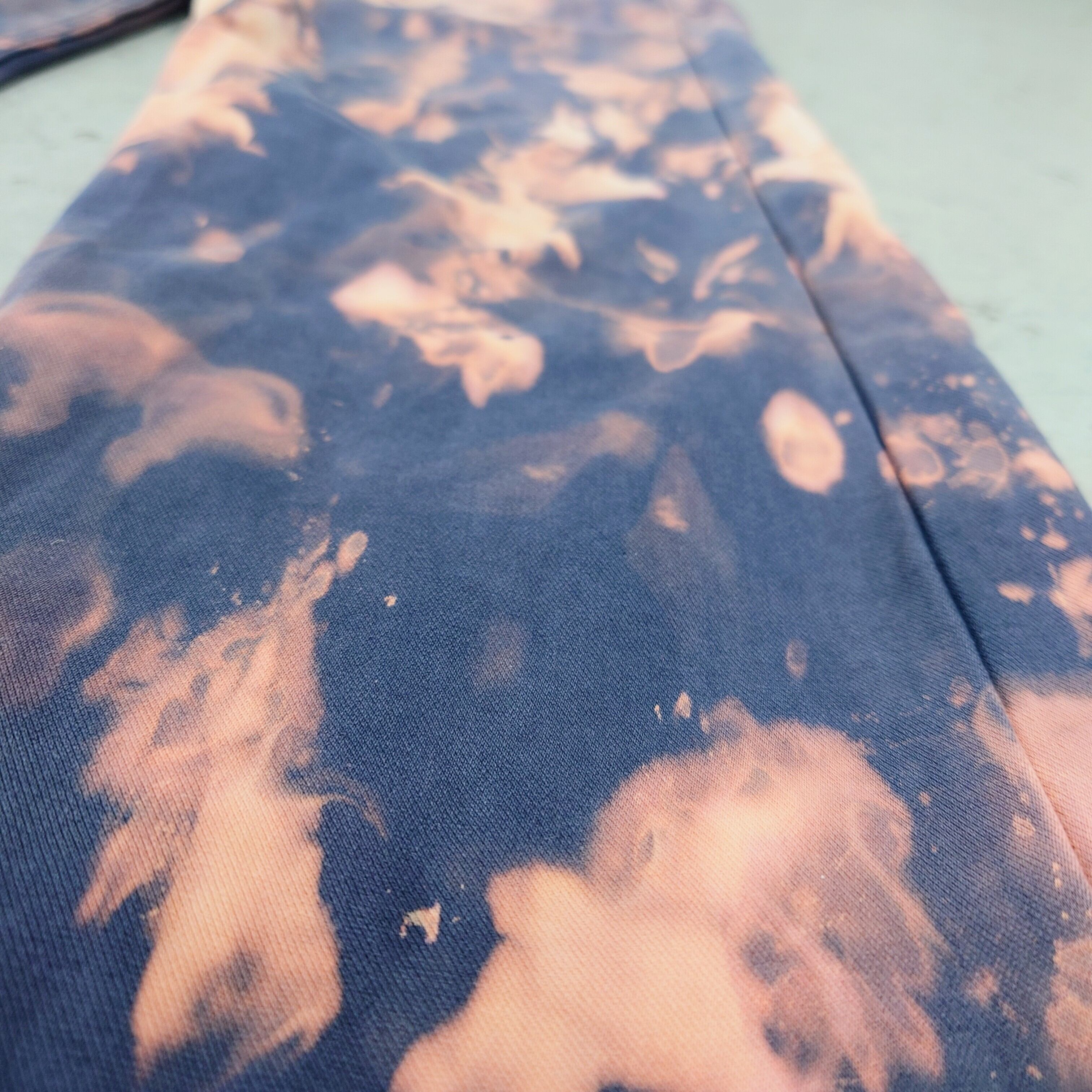 濃紺のチノ生地に絞りを入れて脱色されたインパクトのあるデザイン。