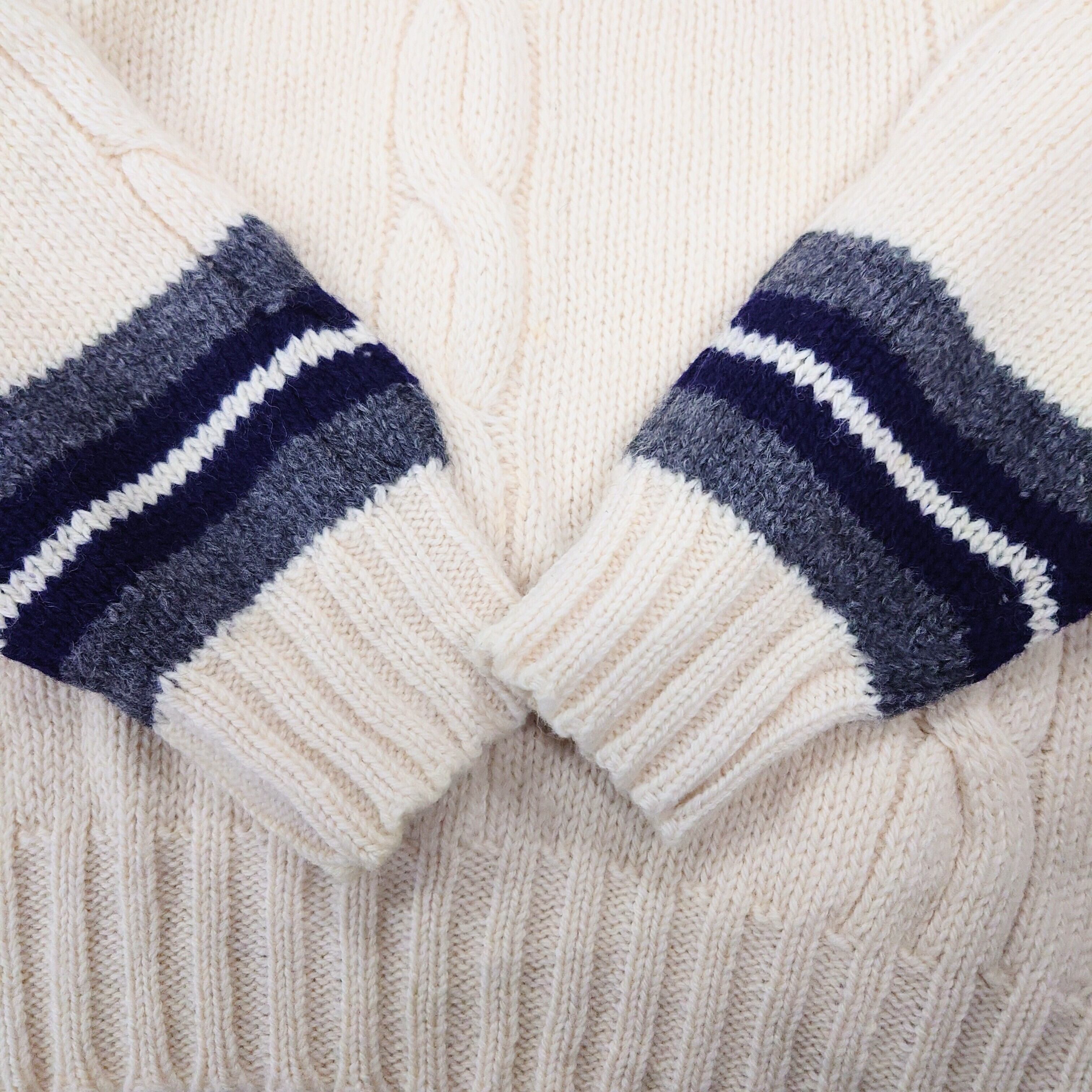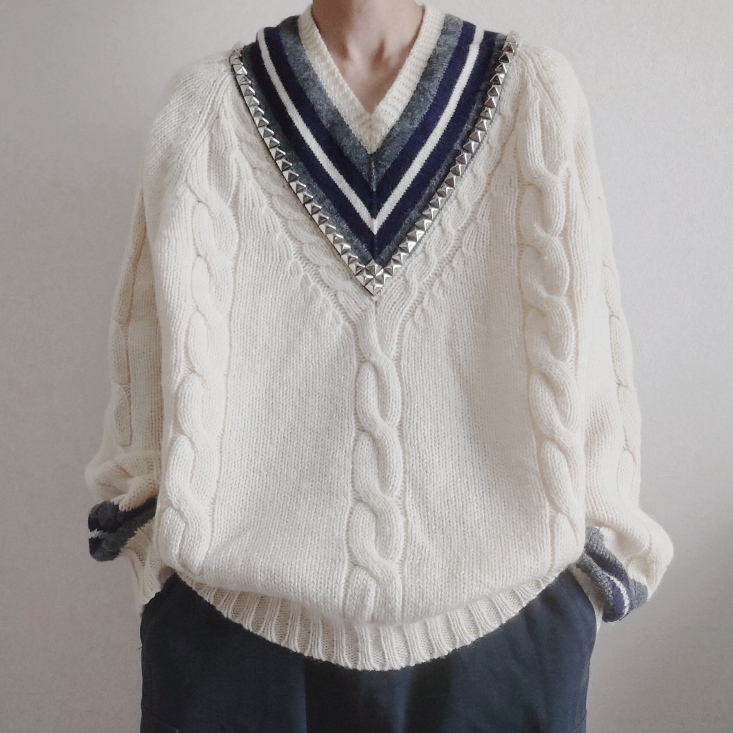 トラッドなチルデンニットにパンキッシュなスタッズの付いたギャップのあるデザイン。